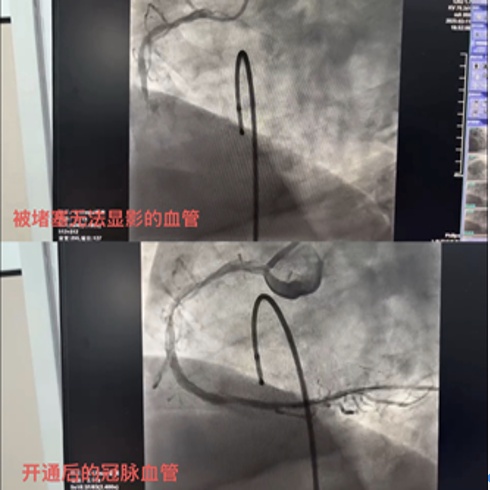 患者回到抢救室后,短短20分钟内反复出现恶性室性心律失常——室速室颤“电风暴”,多次陷入生命边缘。急诊内科与心血管内科团队高效协作,边复苏边实施电击除颤,最终经过6次电击除颤,患者恢复窦性心律,意识转清。随即护送至心导管室。冠状动脉造影检查显示:患者右冠状动脉中段100%闭塞,介入科团队精准操作,顺利开通闭塞血管,恢复心肌供血。术后,患者生命体征平稳,被转入冠心病监护病房(CCU)进一步观察治疗。
