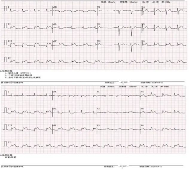 近日,一名69岁的男性患者因突发胸痛来到同济医院急诊内科就诊。患者到达预检台时面色苍白、全身冷汗,值班护士立即将其送至急诊胸痛中心,曾焕医生接诊完成18导联心电图检查,EKG显示急性下壁、后壁及右室心肌梗死,病情极其危急。