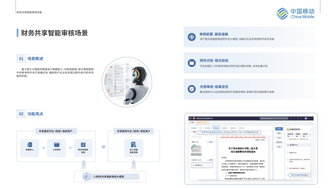 通过深度整合人工智能技术与财务共享服务,中移上研助力中国石油构建了财务智能审核场景。基于大模型的图像语义理解能力,系统可即时解析用户提交的各类单据附件(包括图片、PDF等多格式文件),自动识别差旅报销、费用核销等场景的附件完备性,实现业务审核的前置化与无感化。从票据联次校验到收款方合规性检查,系统内置规则引擎实时完成核心风控指标的智能核验,结合前端可视化看板,将冗杂的审核流程隐于无形,审核结果清晰可溯。