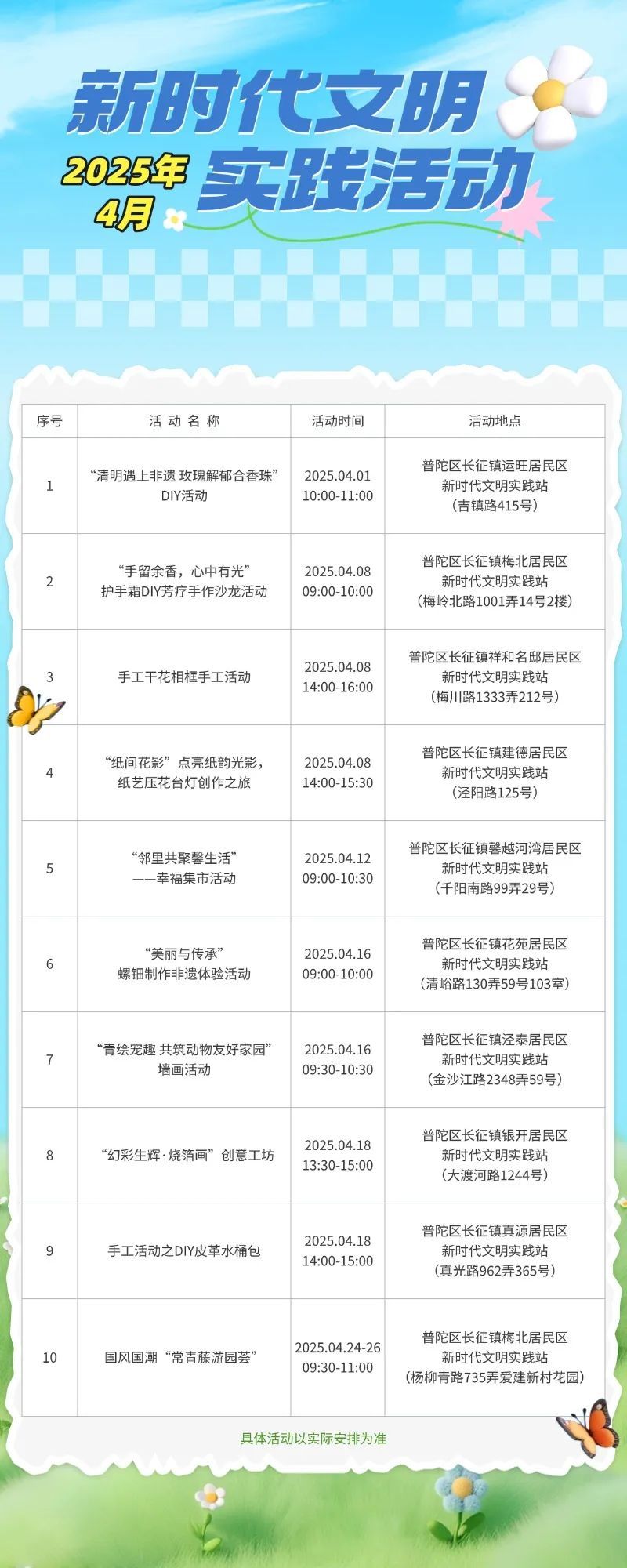 活动地址:普陀区长征镇泾泰居民区新时代文明实践站(金沙江路2348弄59号)