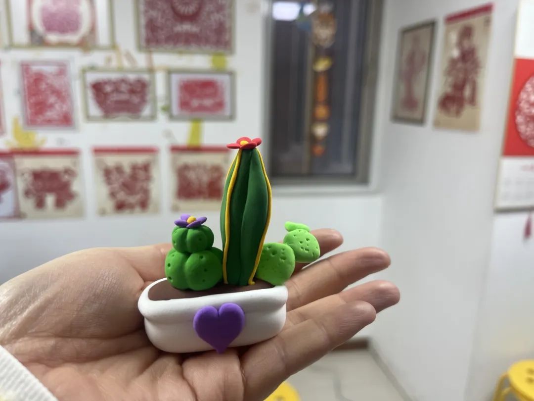 在张书嘉的悉心指导下,彩色面团在指尖逐渐蜕变。一盆盆精致的多肉小盆栽陆续诞生,每一盆都形态各异、生动逼真,叶片纹理清晰,色彩鲜艳自然。这些凝聚着大家心血与创意的作品,不仅是面塑艺术的成果展现,更是对非遗文化传承的小小见证。