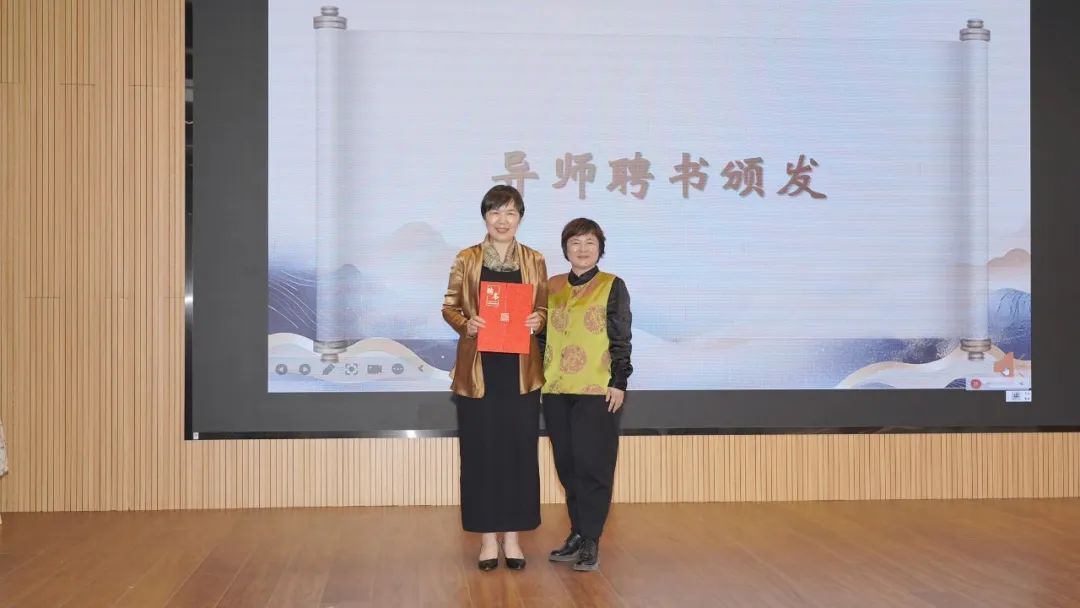 浦东新区书院镇妇联主席茅丹红为采文读书坊主持人蔡文花颁发导师聘书
