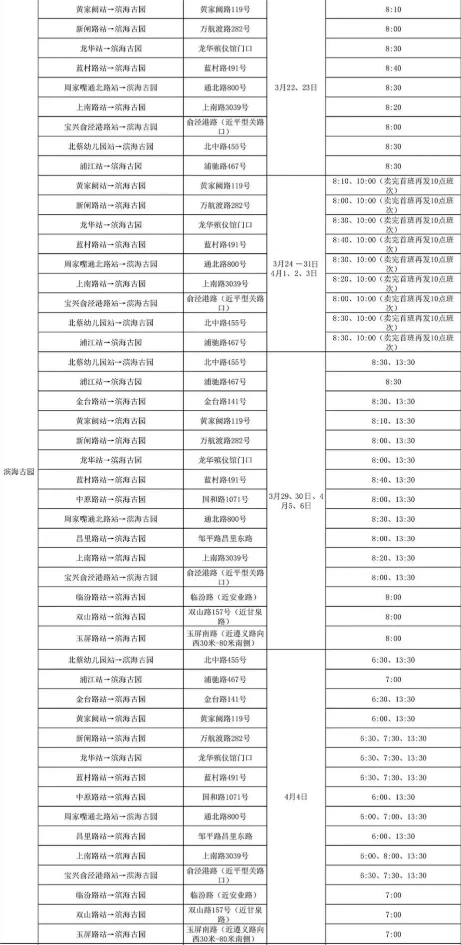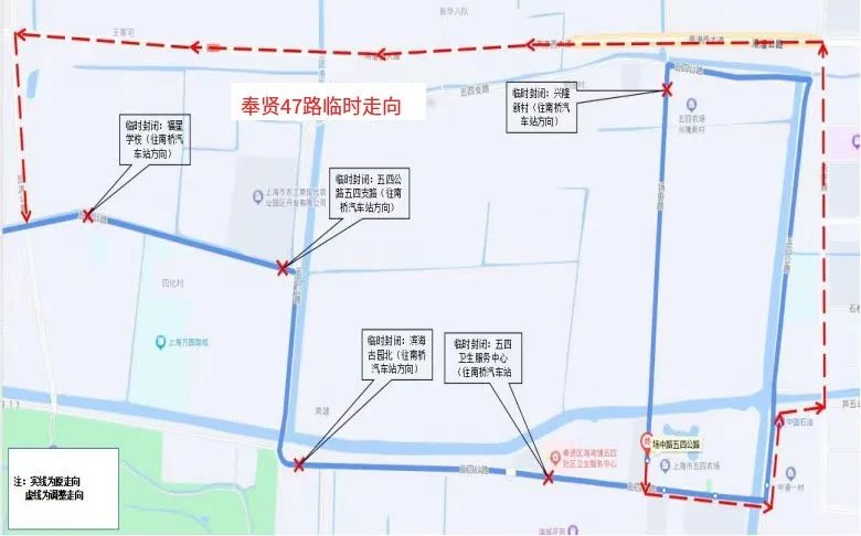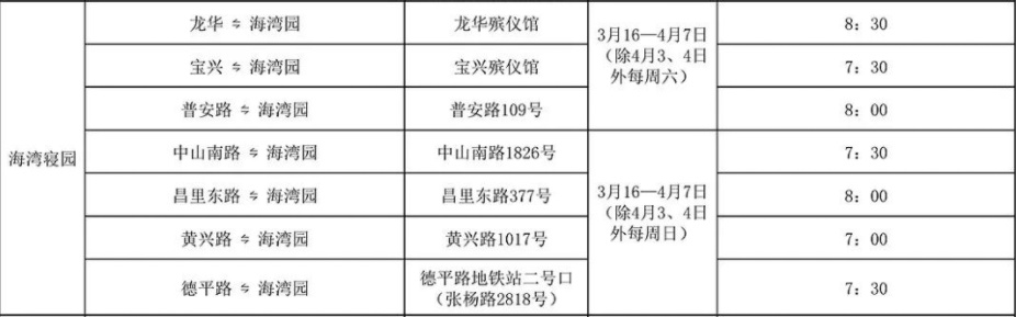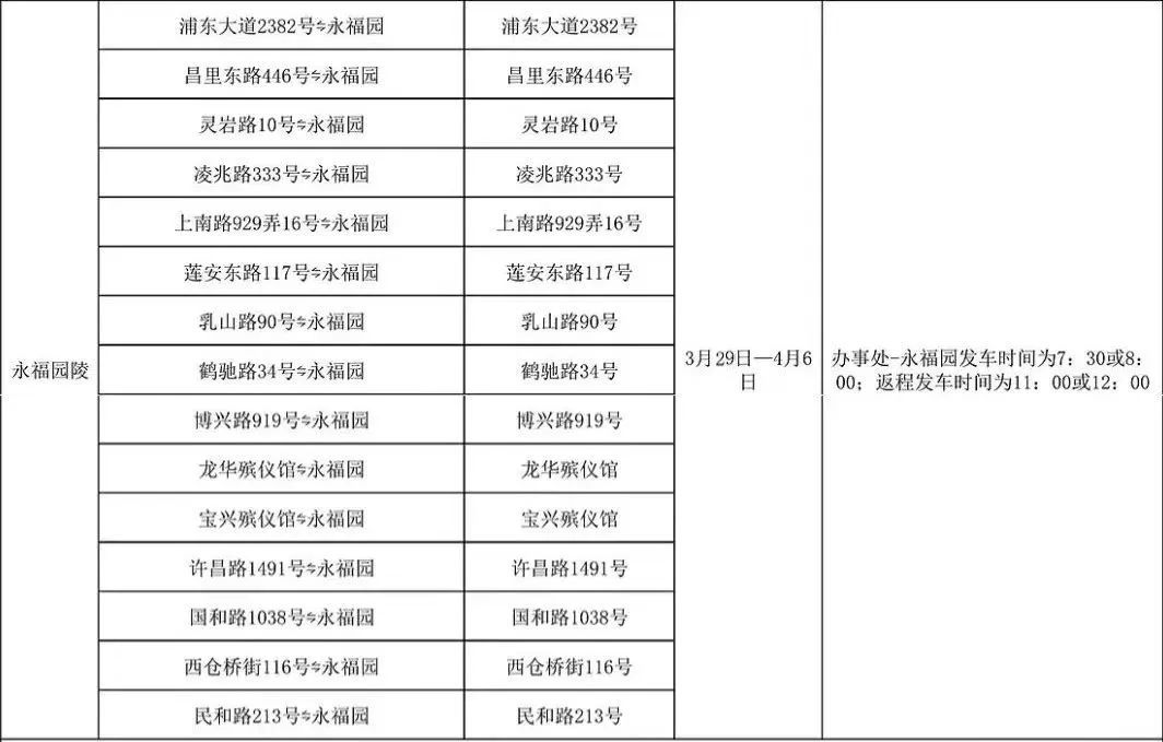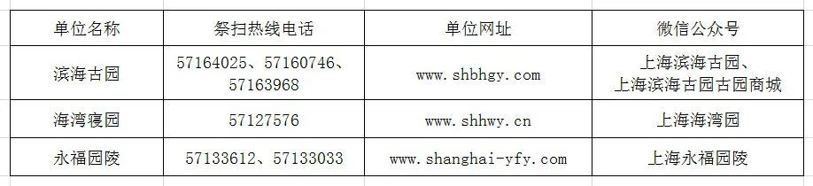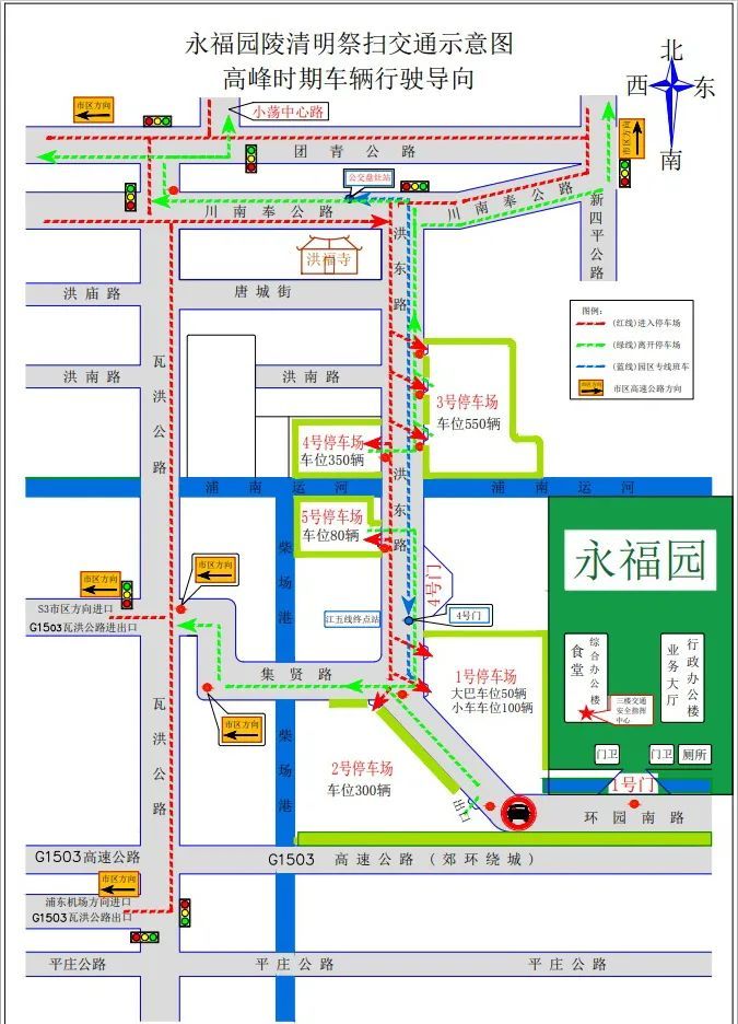 清 明 祭 2 清 明 祭 扫 清明将至,落葬故人活动是我国的民间习俗,今年清明祭扫高峰相对集中在3月29、30日,4月4、5、6日(共5天)。为切实加强2025年清明祭扫期间的道路交通管理工作,确保辖区道路安全有序,奉贤交警做好充分准备,持续加强各大墓区周边路段巡控和路口疏导,积极落实各项交通管理措施,全力确保车流有序通行。 以下为大家整理了奉贤区五四滨海古园、洪庙永福园陵及海湾寝园三大墓区的交通线路以及出行提示。建议广大市民提前规划、错峰祭扫。 奉贤区扫墓点信息一览表 滨 海 古 园 交通示意图 推荐路线 车辆进墓区: 1.S2—新四平公路—港漕公路—老四平公路—-五四支路—五四公路—古园大道—墓区 2.S3(S2)—G1503—瓦洪公路—五四公路—古园大道—墓区 3.平庄公路(港漕公路)—瓦洪公路—五四公路—古园大道—墓区 4.S3(S2)—G1503—瓦洪公路—随塘河路—仰古路—古园环路—1号停车场(仅大巴士通行线路) 车辆出墓区: 1.海古路(园外路)—场中路—五四公路—芦五公路—承贤路—新四平公路—市区 2.仰古路—随塘河路—洪朱路—市区(仅大巴士通行线路) 停车攻略: 墓区内1号停车场(仅供大巴士停放)、2号停车场停车场及海古路沿线路路边停车位 清明定点班车 向下滑动查看所有内容 临时交通管制 滨海古园周边公交车改线时段:3月29日~30日、4月5日~6日,每日7:00~13:00;4月4日,7:00~14:00。 1.四团2线 管制期间临时调整走向: 公交四团站→场中路五四公路方向:自公交四团站起循原线至江山路、承贤路、港漕公路、场中路至场中路五四公路止; 场中路五四公路→公交四团站方向:线路走向不变。 临时取消停靠站点:承贤路江山路、五四公路芦五公路、五四社区(均为场中路方向单向站)。 2.奉贤47路 管制期间临时调整走向: 场中路五四公路→南桥汽车站:自场中路五四公路起经场中路、五四公路、芦五公路、承贤路、港漕公路、瓦洪公路、五四公路循原线至南桥汽车站止; 南桥汽车站→场中路五四公路方向:线路走向不变。 临时取消停靠站点:兴隆新村、五四卫生服务中心、滨海古园北、五四公路五四支路、福星学校(均为南桥汽车站方向单向站)。 3.江五线 管制期间临时调整走向: 五四社区→江月路地铁站:自五四社区起经五四公路、场中路、港漕公路、瓦洪公路、五四公路循原线至江月路地铁站止; 江月路地铁站→五四社区方向:线路走向不变。 临时取消停靠站点:五四卫生服务中心、滨海古园北、五四公路五四支路、福星学校(均为江月路地铁站方向单向站)。 4.海湾3线 管制期间临时调整走向: 瞭海路海农公路→新杨公路芦五公路:自瞭海路海农公路起循原线至五四公路、五四公路(南)、芦五公路循原线至新杨公路芦五公路止。 临时取消停靠站点:健生教育中心、五四支路三团港中心路、兴隆新村、场中路五四公路(均为往新杨公路芦五公路方向单向站) 管制期间临时调整走向: 新杨公路芦五公路→瞭海路海农公路:自新杨公路芦五公路起循原线至江山路、承贤路、港漕公路、场中路、五四支路、五四公路、随塘河路循原线至瞭海路海农公路。 临时取消停靠站点:承贤路江山路、五四公路中港场部桥、五四社区、场中路五四公路、兴隆新村、五四公路五四支路、福星学校、五四公路洪卫港桥、洪朱公路五四公路(往瞭海路海农公路方向单向站)。 5.附近道路限行: 洪朱公路五四公路禁止货车向东,瓦洪港漕禁止货车往南,港漕四平禁止货车往南,芦五承贤禁止所有车辆往西。 永 福 园 陵 交通示意图 推荐路线 车辆进墓区: 1.G1503(S3)—瓦洪公路—川南奉公路—洪东路—墓区 2.S3—团青公路—瓦洪公路—川南奉公路—洪东路—墓区 3.S2-新四平公路—川南奉公路—洪东路—墓区 车辆出墓区: 1.洪东路(环园南路)—集贤北路—瓦洪公路—G1503—市区 2.洪东路—唐城街—瓦洪—川南奉公路 3.洪东路—川南奉公路 停车攻略: 墓区内P1、P2、P3、P4、P5停车场及部分墓区周边路边临时停车点 清明定点班车 临时交通管制 附近道路限行: 洪东路(浦南运河—集贤北路)段北向南单行、集贤北路(瓦洪公路—洪东路)段西向东单行 海 湾 寝 园 交通示意图 推荐路线 车辆进墓区: 1.S4海湾出口—海湾路—海马路—海乐路—海湾寝园正门 2.S4海湾出口—海湾路—海马路—海湾寝园北门 3.S4海湾出口—海湾路—1号停车场(仅大巴士通行线路) 车辆出墓区: 1.金汇塘路—海湾路—S4 2.海乐路(南)段—海鸥路—奉炮路—奉柘公路—浦星公路—G1503 3.海马路—海乐路(北段)或南海支路—海思路—南海公路 4.海鸥路(海乐路以西段)—海航路—南海公路 5.海鸥路(海乐路以东段)—奉炮公路、浦星公路或海湾路 停车攻略: 墓区内1号停车场(仅供大巴士停放)、2号、3号、4号、5号停车场及海乐路、海鸥路等沿线路边临时停车点 清明定点班车 临时交通管制 海湾寝园周边公交车改线时段:3月29日~30日、4月4日~6日(每日具体管制起止时间按照现场交警指挥) 1.海航专线 管制期间临时调整走向:沈杜公路地铁站→海湾方向:自沈杜公路地铁站起循原线至海湾路海思路口向南改道,经海湾路至海湾路金汇塘路止;返程相同。 临时取消停靠站点:华东理工大学(双向) 2.海湾1线 管制期间临时调整走向:瞭海路海农公路→海湾方向:自瞭海路海农公路起循原线至海湾路海思路口向南改道,经