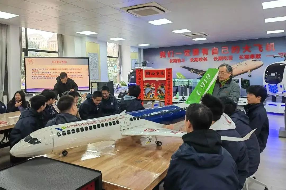 高一学生在科技总辅导员和同济大学导师带领下通过“学习馆”AR-VR模拟飞行场景,配以“学习馆”的飞行器学具,解构大国飞机中所蕴藏的数学、物理、工程学等多学科知识;