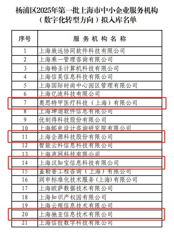 近日,上海市经济和信息化委员会公示了2025年第一批中小企业服务机构(数字化转型方向)入库名单,杨创园区企业——奥思特甲医疗科技、企源科技、汉知宝信息科技、驰亚信息技术入选!这意味着杨浦区在数字经济生态培育和企业服务能力建设方面取得新突破,为区域创新驱动发展再添重要成果。