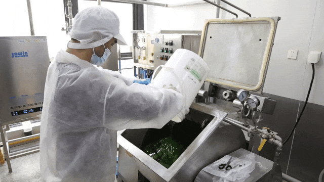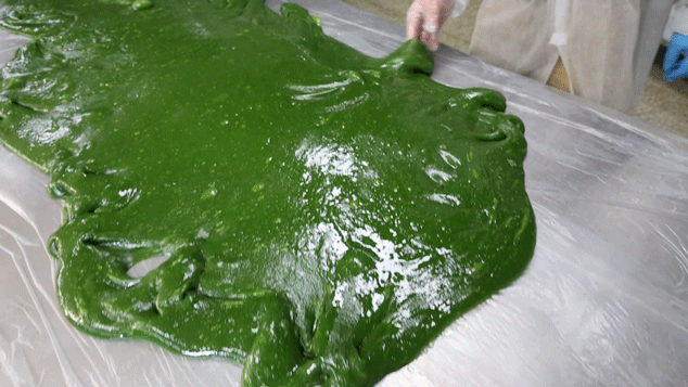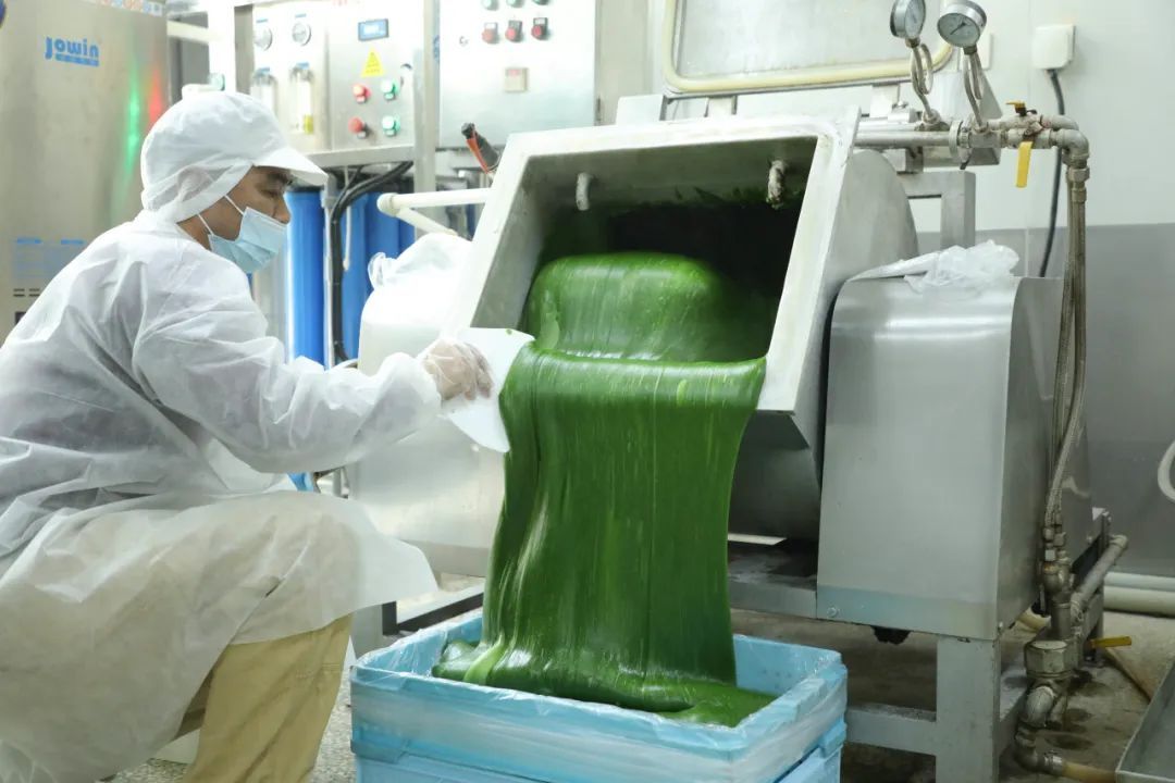 来到工作间,一阵清新的自然香气迎面而来。早晨八点,师傅们已经开始了一天的忙碌,糯米粉、青苗汁、麦芽糖浆、食用油等原料按比例与先后顺序倒入搅拌机,原料在轰隆作响中慢慢融合。十分钟后,原本松散的材料就变成了色泽均匀、质地细腻的绿色面团。