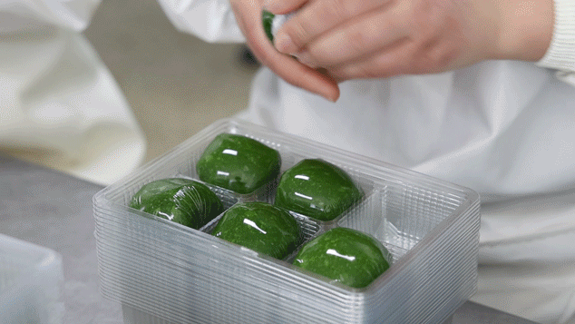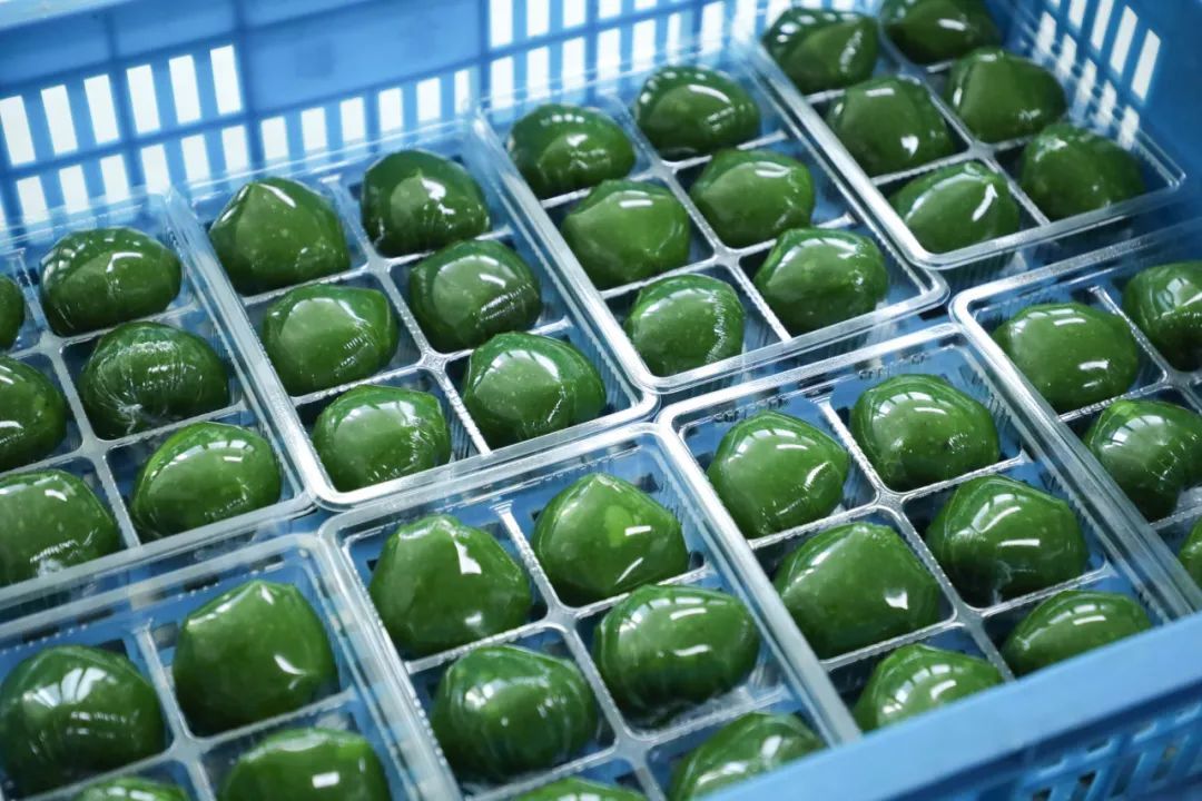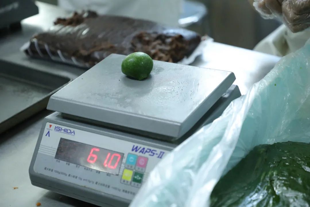 包制工作间一派繁忙景象,工人们的手法快得让人眼花缭乱,大家分工明确,取皮、称重、包馅、收口,一气呵成。每个青团都严格控制在皮60克、馅20克的黄金比例,确保口感恰到好处。一个个浑圆饱满的青团就这样诞生啦!