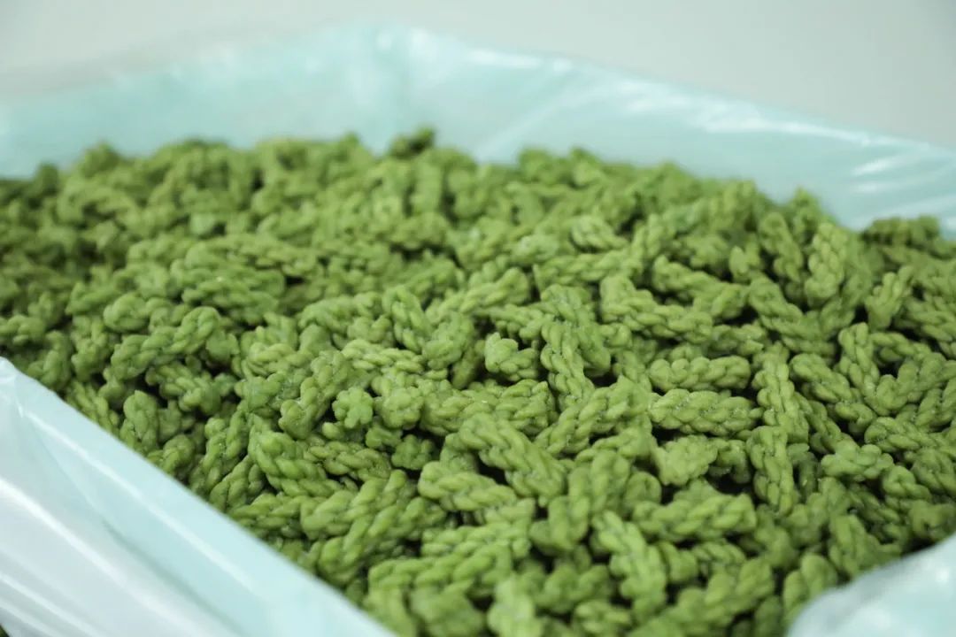 搅拌完成后,师傅们动作利落地在筐里刷油,将温热的青团皮盛入其中,仔细摊开在桌上晾凉,为下午的包制做好前期准备。闻厂长介绍道:“我们做的青团保质期只有7天,因为不添加防腐剂,糖量也控制得很精准,就是要做出既健康又好吃的传统味道。”