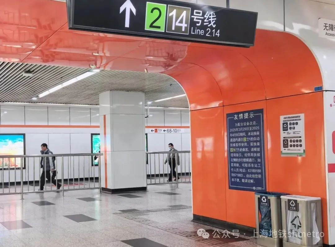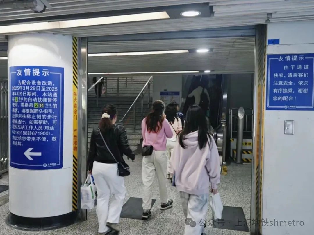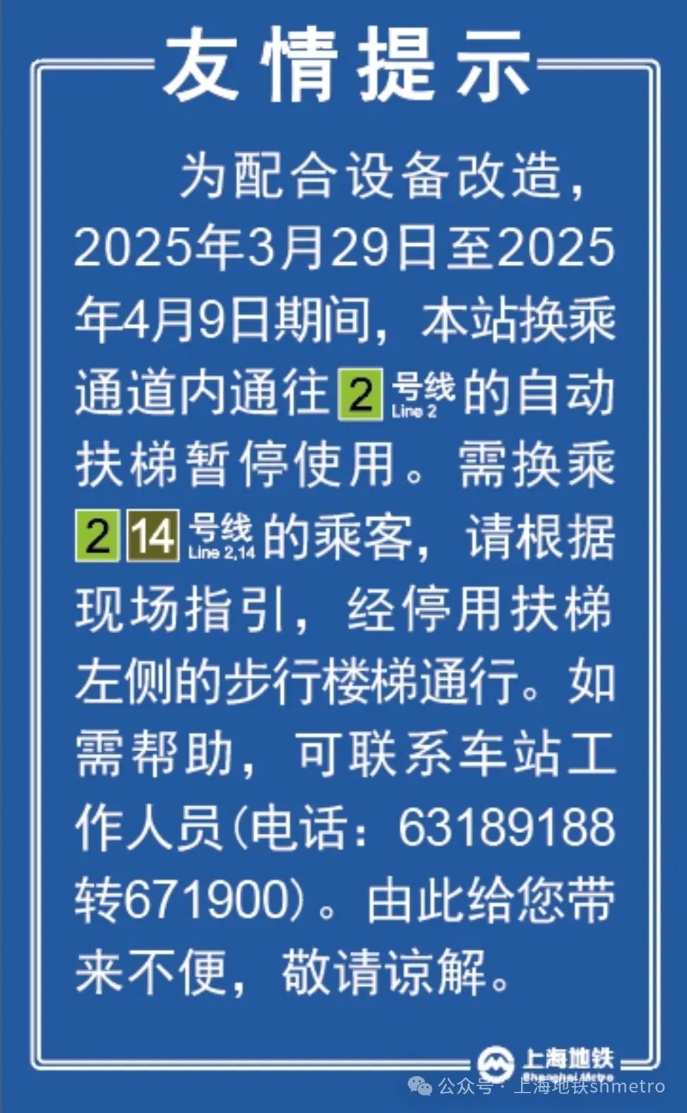 2025年3月29日至2025年4月9日期间,静安寺站7号线换乘2、14号线通道内上行方向自动扶梯将进行升级改造。请需要换乘2、14号线的乘客依照车站“友情提示”有序通行。改造期间如需帮助,可根据“友情提示”联系车站工作人员。