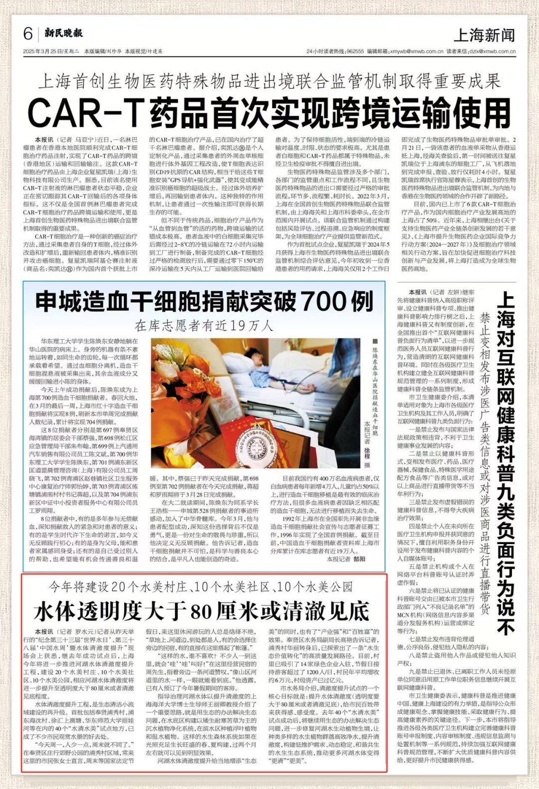 3月24日,“纪念第三十三届‘世界水日’、第三十八届‘中国水周’暨水体清澈度提升”成功举行,继去年成功试点后,上海今年将进一步推进河湖水体清澈度提升工程,建设20个水美村庄、10个水美社区、10个水美公园,相应河湖水体清澈度将进一步提升至透明度大于80厘米或者清澈见底程度。