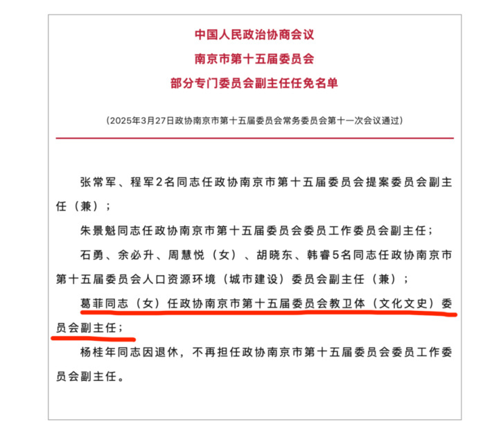 3月27日,南京发布最新人事任免,葛菲同志(女)任政协南京市第十五届委员会教卫体(文化文史)委员会副主任。