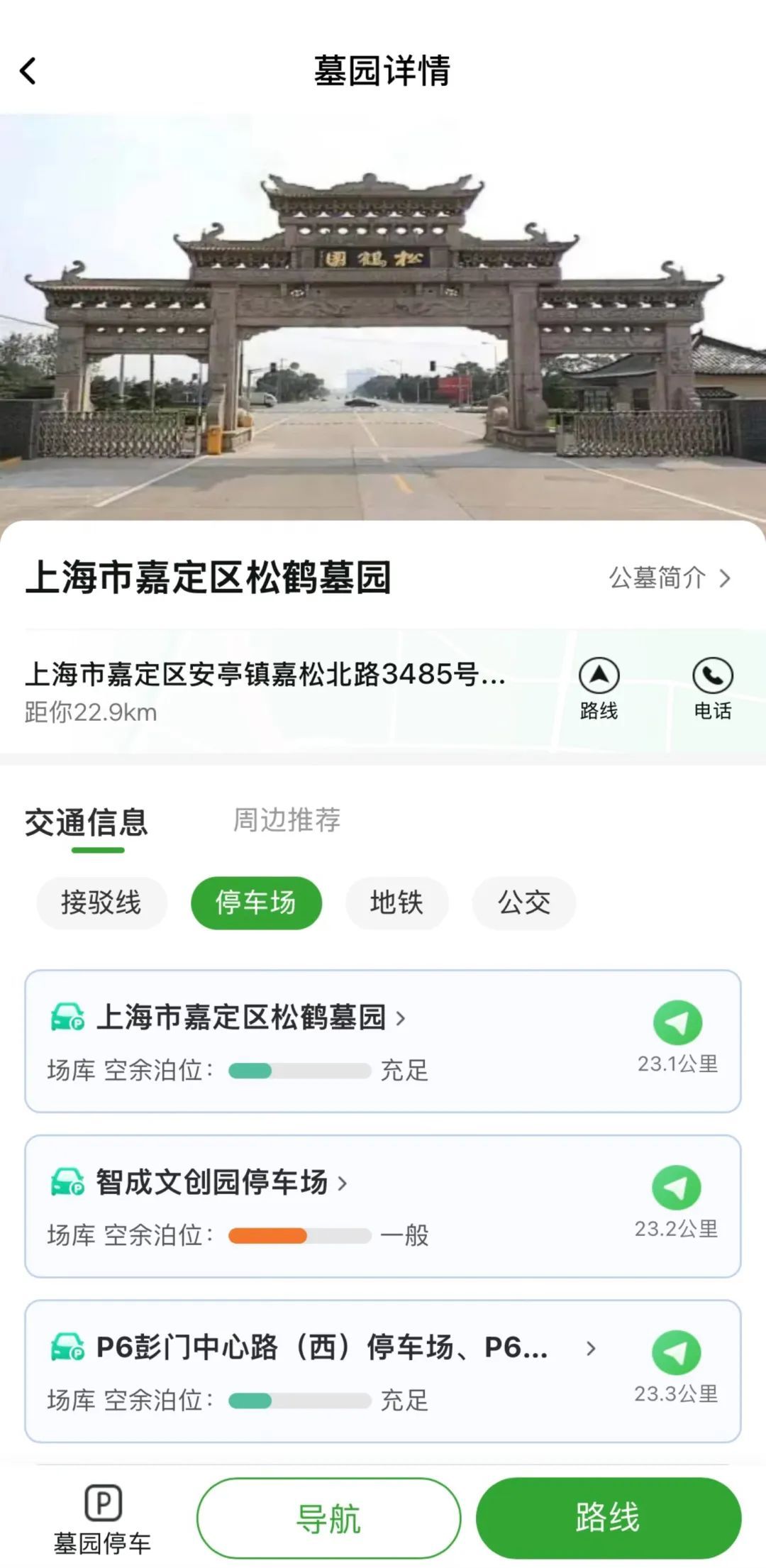 自驾用户:点击墓园详情页下方“导航”,轻松规划自驾行程。再至“交通信息”-“停车场”提前获悉周边车位实时余量、收费标准等信息,导航直达,告别停车烦恼。