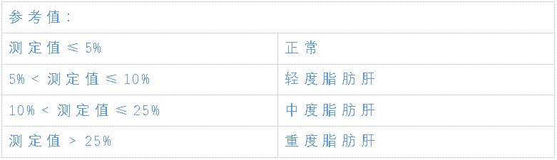 • 它可用于肥胖、糖尿病等代谢性、内分泌疾病高危人群了解自己的脂肪肝程度,也可以评估瘦人型脂肪肝程度;