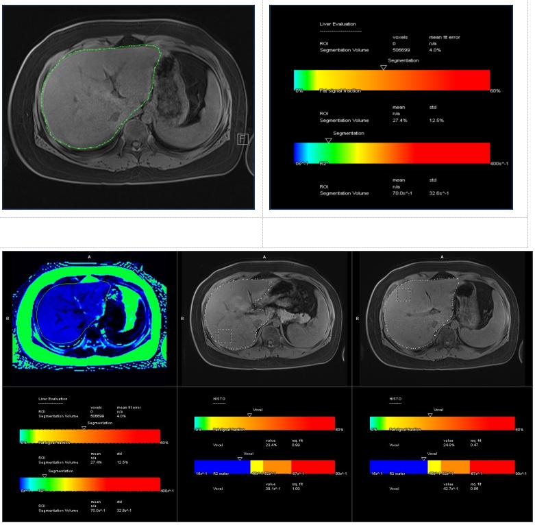 图:一例肥胖患儿的重度脂肪肝的脂肪定量MRI影像,测定肝脏脂肪分数平均为27.4%,肝右后叶脂肪分数为23.4%,肝右前叶脂肪分数为24.8% 诊断为重度脂肪肝。