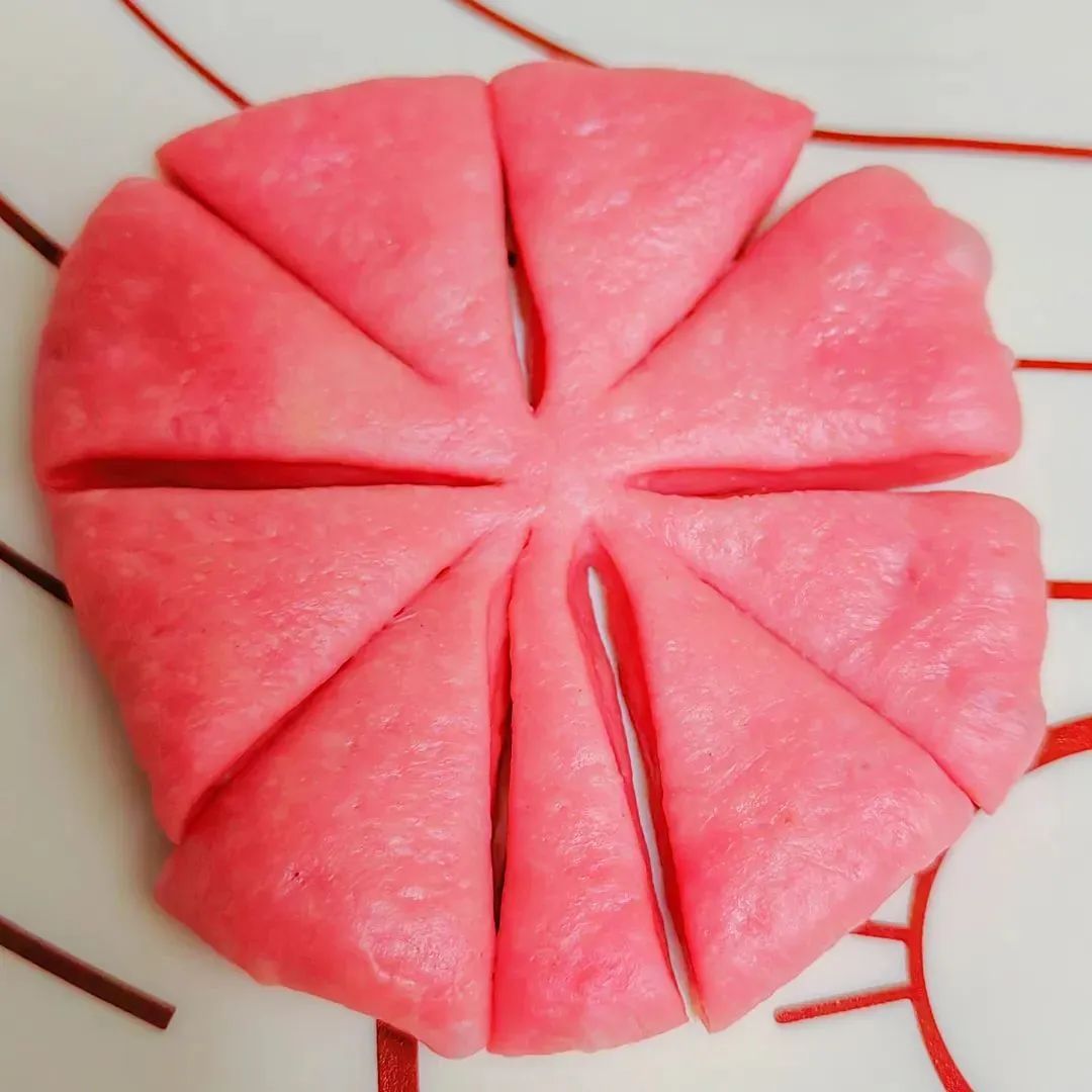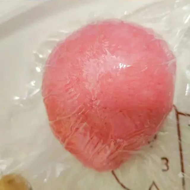 1.将面团材料搅拌揉匀,揉出薄膜后,分100克面团加入红色色素揉匀。在剩余面团中加入8克抹茶粉继续揉匀,将两个面团分两个容器,放进30℃烤箱发酵1小时。将发酵好的面团进行排气,把两个不同颜色的面团分别分成3份,松弛20分钟。