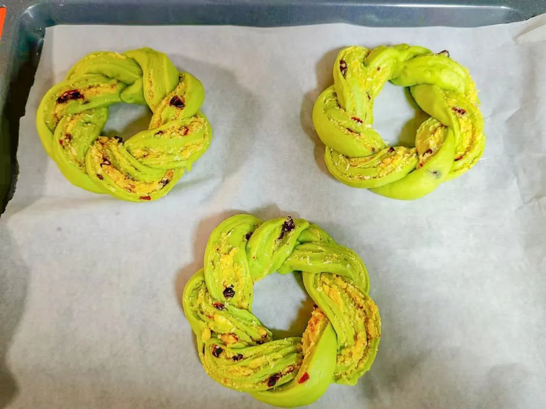 4.分出一部分红色面团,捏成一个个小球,放在面包上装饰,三个花环全部完成以后,放进35℃的烤箱中,发酵40分钟。
