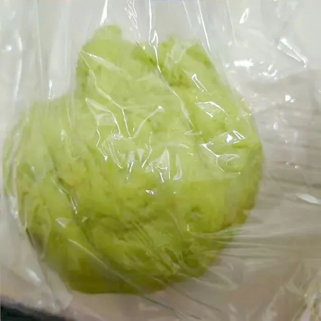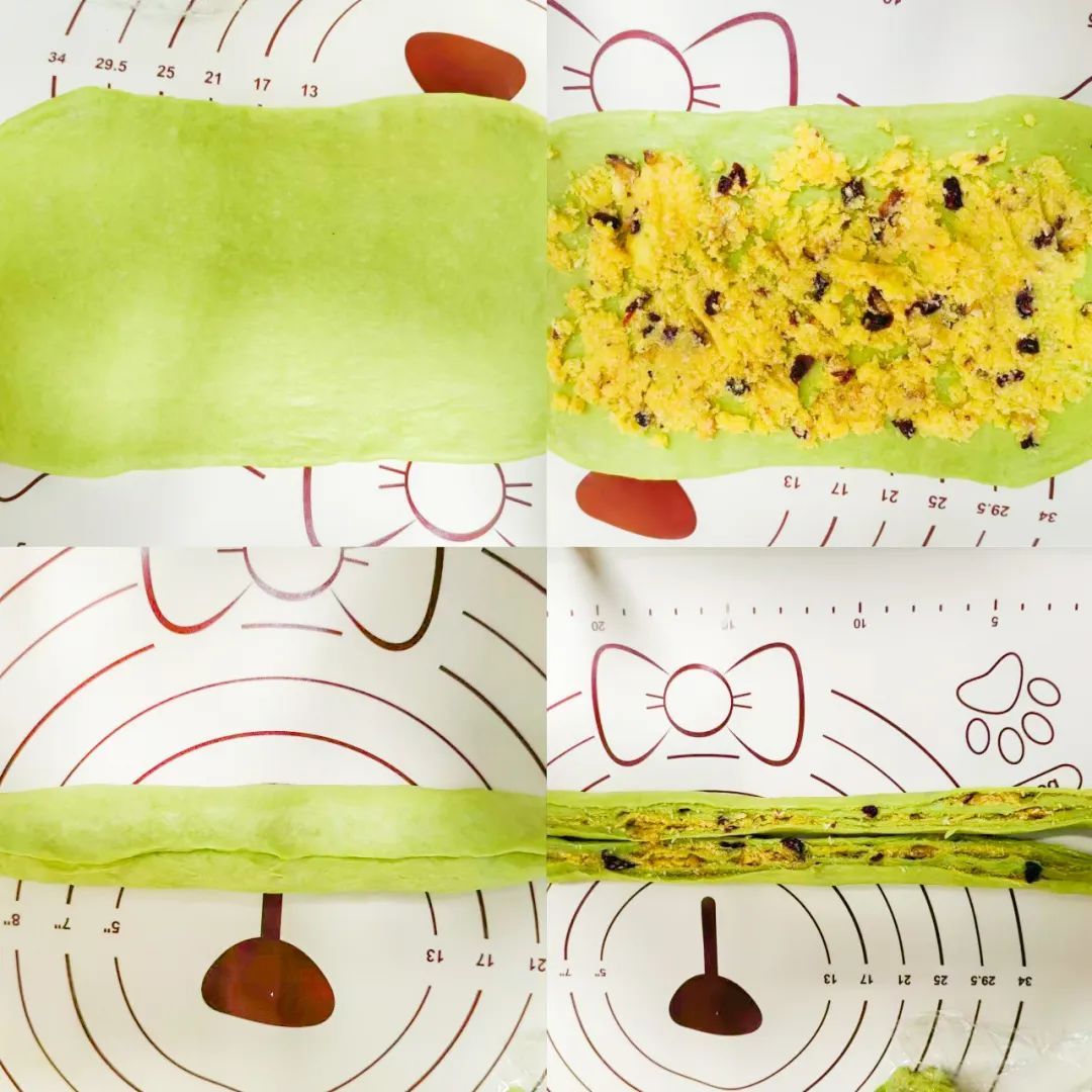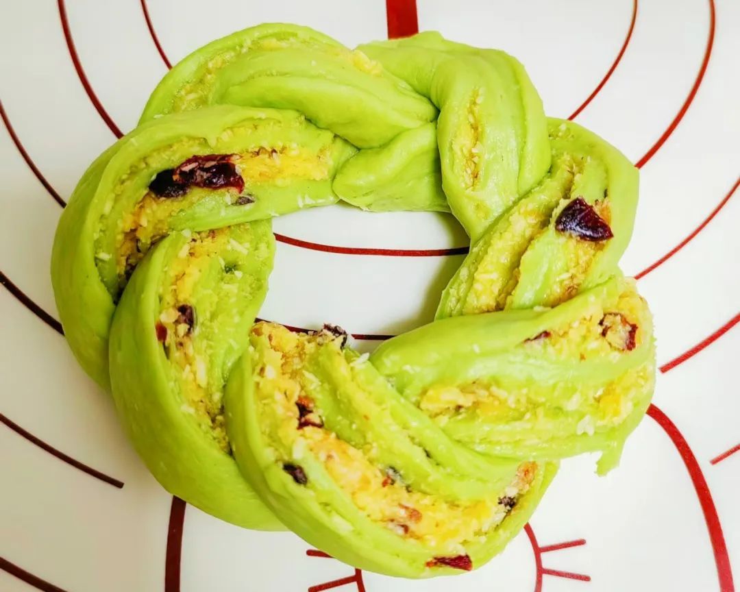 3.将松弛后的绿色面团擀成长方形,铺满椰蓉馅后卷起来,收口捏紧,再揉长一点,从中间切成两条交叉卷起来,首尾捏成一个圈。