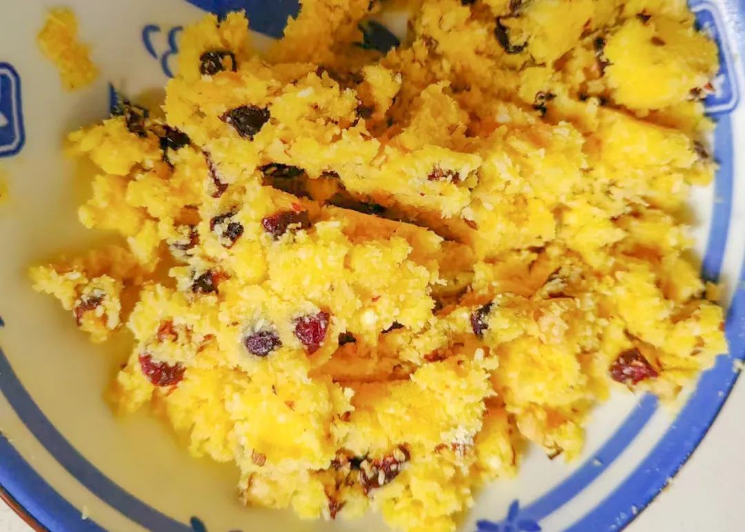 椰蓉馅材料:黄油30克、奶粉20克、砂糖20克、蛋液70克、椰蓉70克、蔓越莓50克。