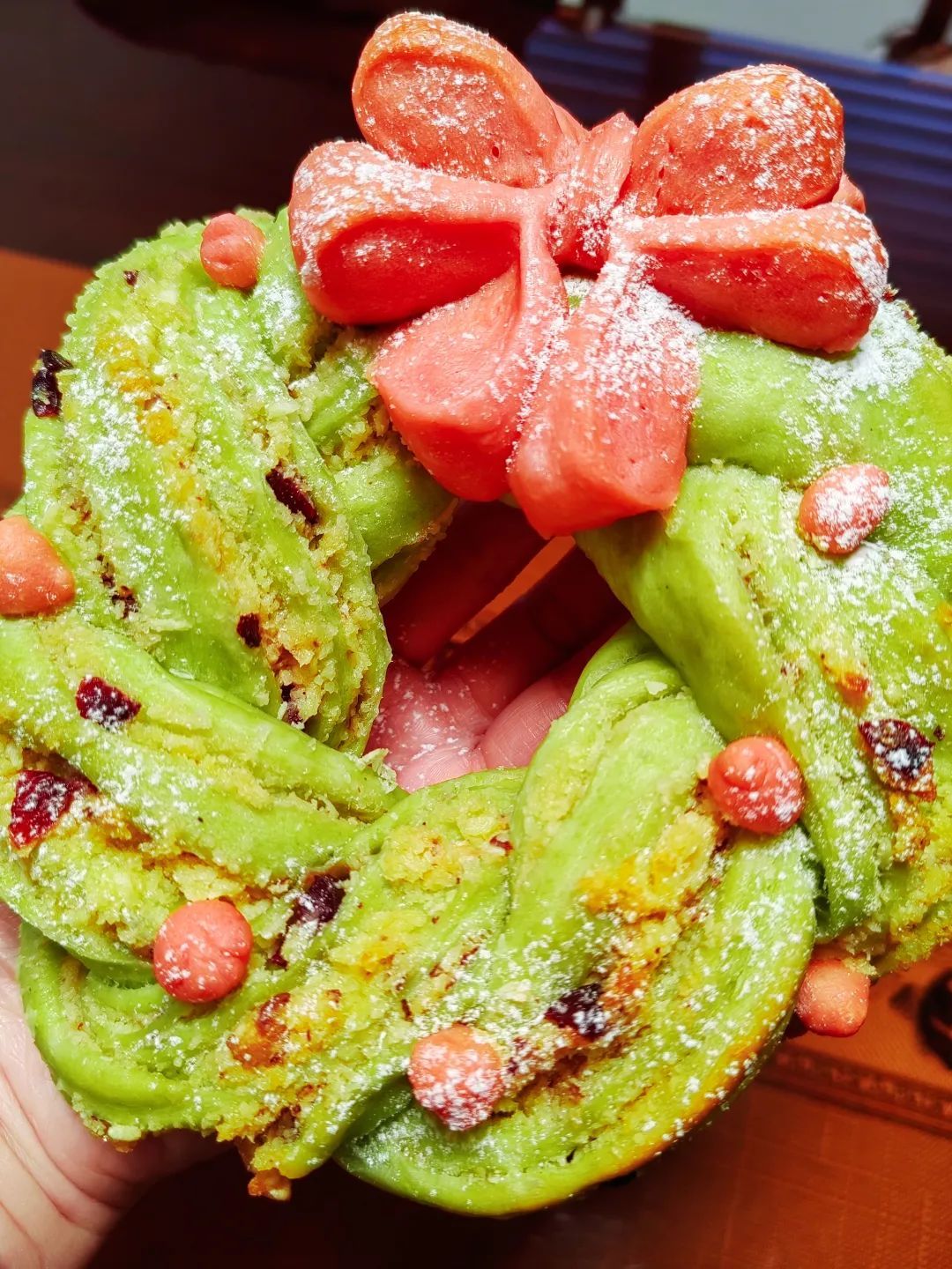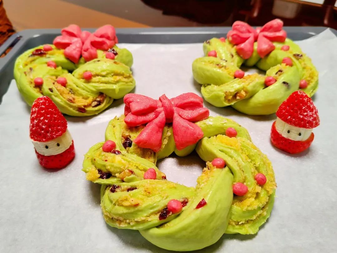 6.红绿面团分别发酵结束以后,将蝴蝶结放在花环接口处,撒上糖霜。烤箱预热,170℃烤25分钟,观察面包,如果发现上色,马上盖上锡纸,以防着色太深。