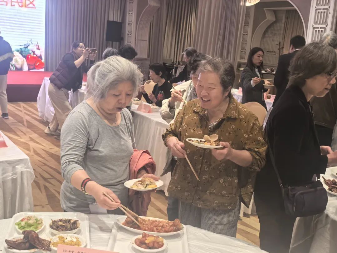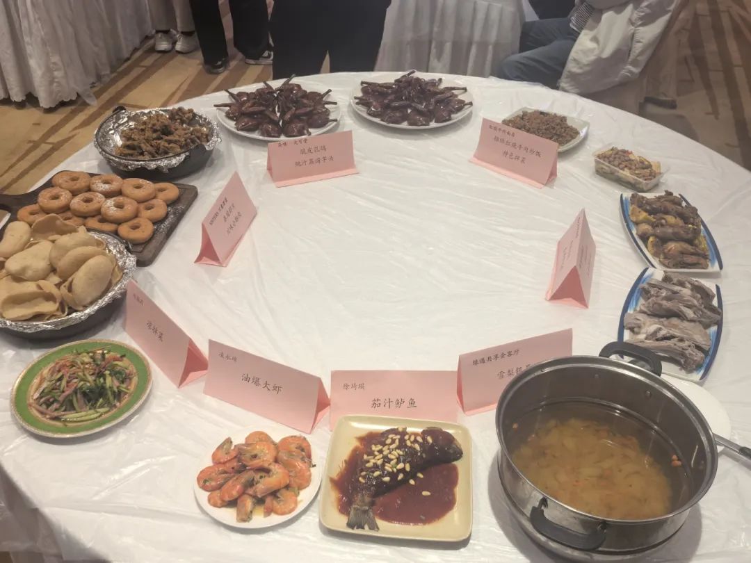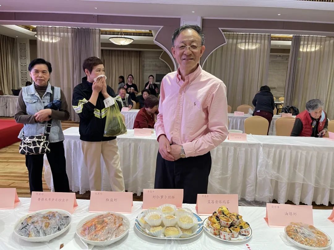 饭店四楼大厅里,欢声笑语不断。居民们带来了自己亲手做的各种美食,竹笋烧肉、油爆虾、香酥鸡中翅、四喜烤麸、豆腐衣卷肉、浓香罗宋汤……一道道美食色、香、味俱全,引人垂涎,每道菜前还用红纸头写着菜名和制作者的名字。