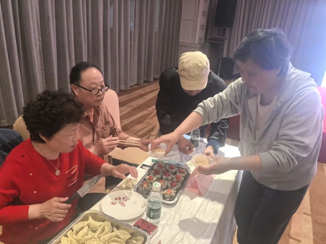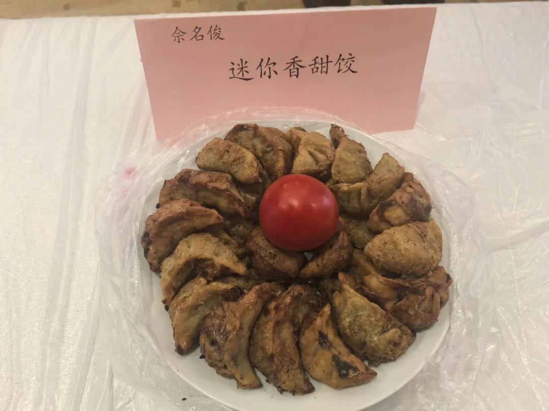 居民翁申君带来两样别具特色的菜肴:花漾寿司和特色元宝饺。花瓣状的寿司饭团上镶嵌着红彤彤的草莓,造型好看。特色元宝饺是皮薄馅大的东北水饺,翁申君说她年轻的时候在东北插过队,很喜欢东北水饺的味道,所以这次特别包了一大盘东北水饺给大家品尝。