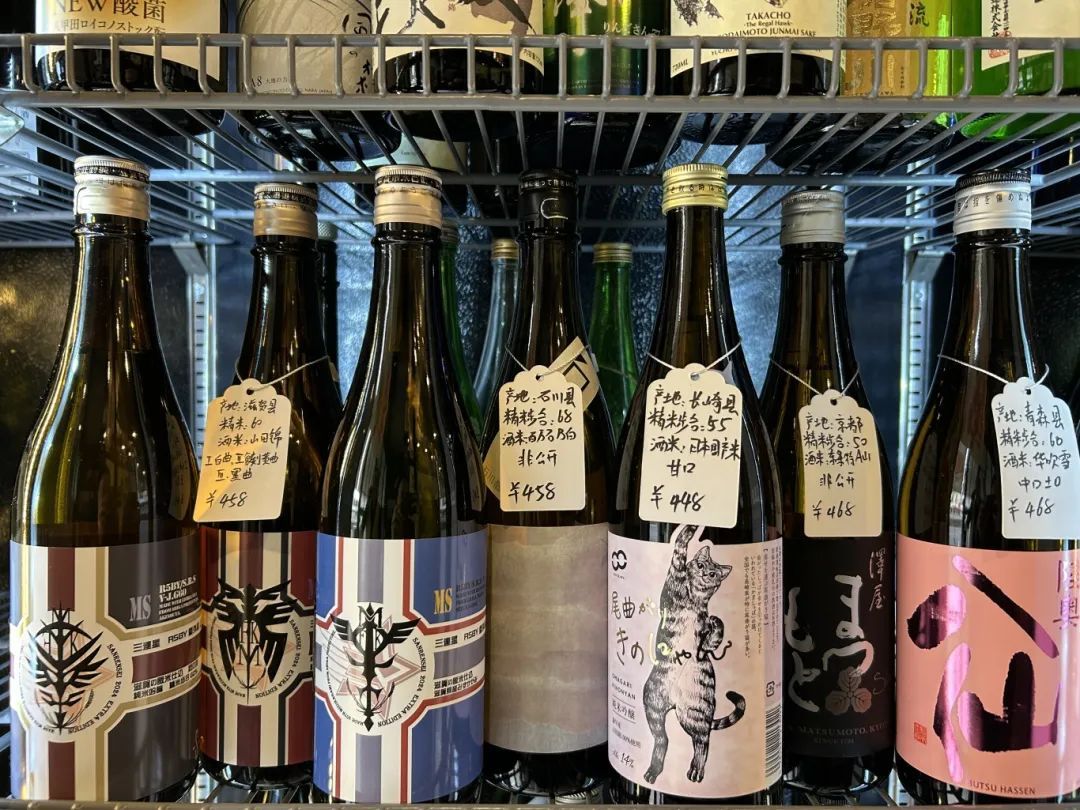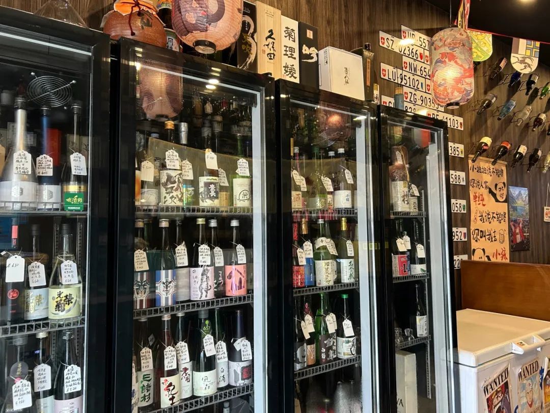 中午,来这里吃一顿性价比颇高的定食的客人较多。到了晚上,不少熟客都会来找老徐喝喝清酒。在店门口的冰箱里,放着数量种类不少的清酒。“在虹口这块地方,我估计我们店的清酒种类算是相当多、相当广的了。”老徐说,之前在瑞士生活学习时,开始接触酒文化,喝过啤酒、红酒、威士忌,最终还是喜欢清酒,还考了唎酒师的证书,“对于刚接触清酒的新手,我基本上会推荐一些花果香味比较重的,口感带点甜、带点气泡的,因为有些酒的味道对新人来说可能并不适应。对熟客的话,我会根据他们的个人喜好来推荐。”