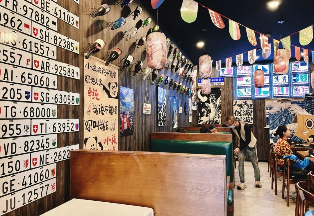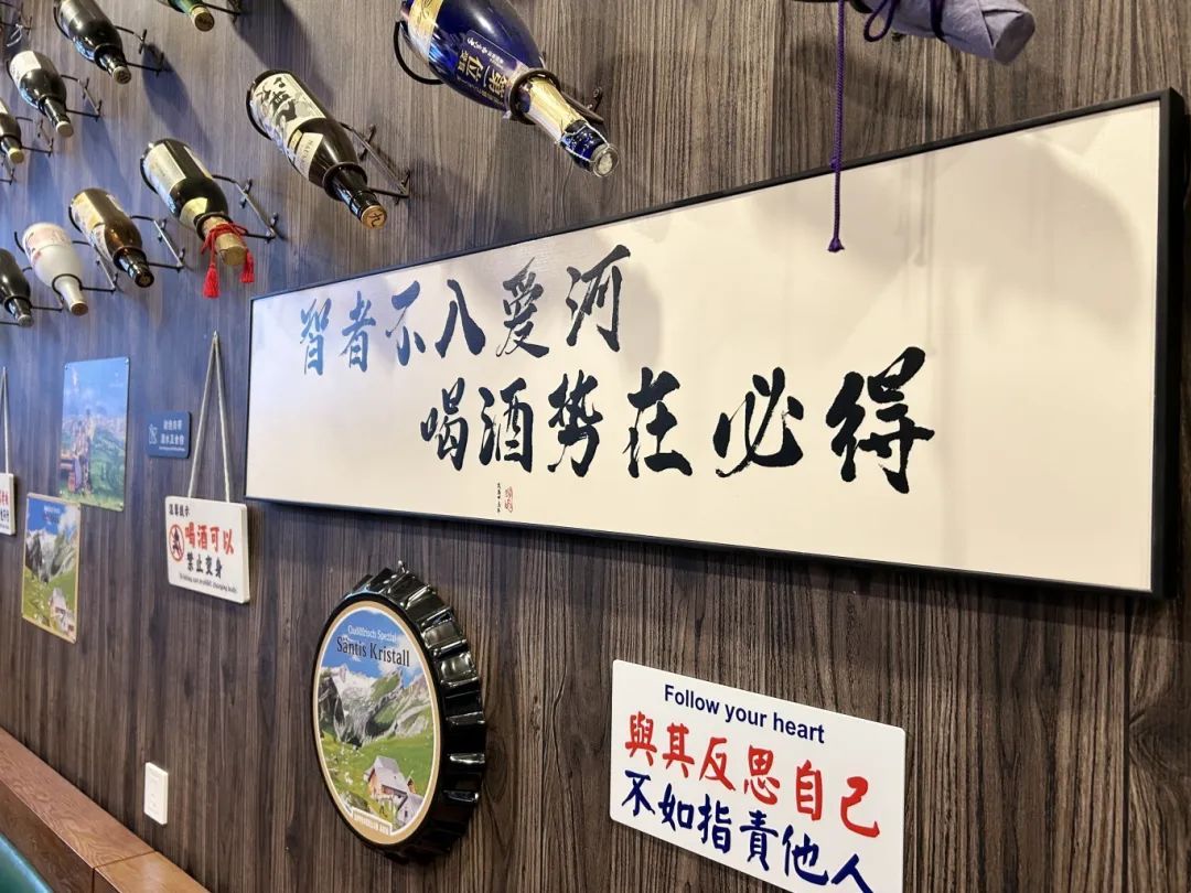 “酒道”是一家沿街面小店,低调的门头,并不显山露水。拉开移门,踏入其中,氛围感满满的装饰让人一下子卸下疲惫,走进一个温馨轻松、能和朋友微醺畅聊的“小世界”。满墙的清酒瓶,是老板和客人们的“战利品”;笑点十足、槽点满满的墙面标语,体现了老板的“喜剧人”个性;引人注目的瑞士车牌、各州州旗,则和老板老徐的海外生活经历有关。