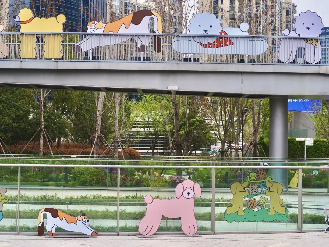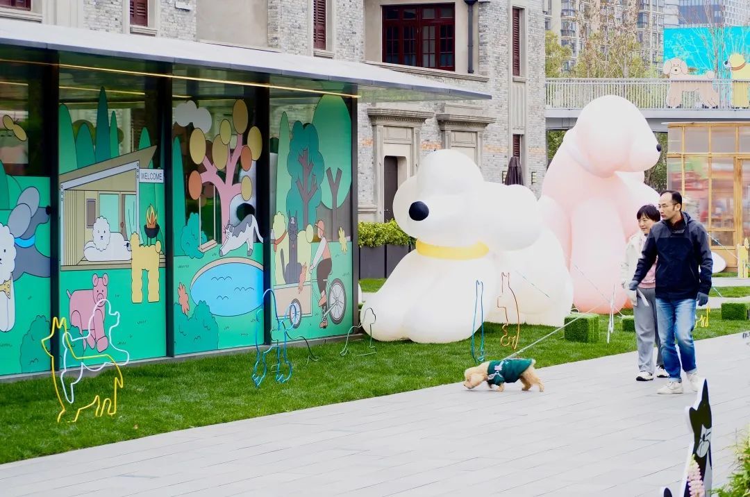 画风轻松、富有童趣的插画师Liujiayin,用温暖的笔触在超大面积的公园绿地和开放式峡谷街区商业的建筑形态中,创造了100只猫猫狗狗,并通过她的Puppy White小狗角色打造出人类与宠物共同享受的全新乐园。