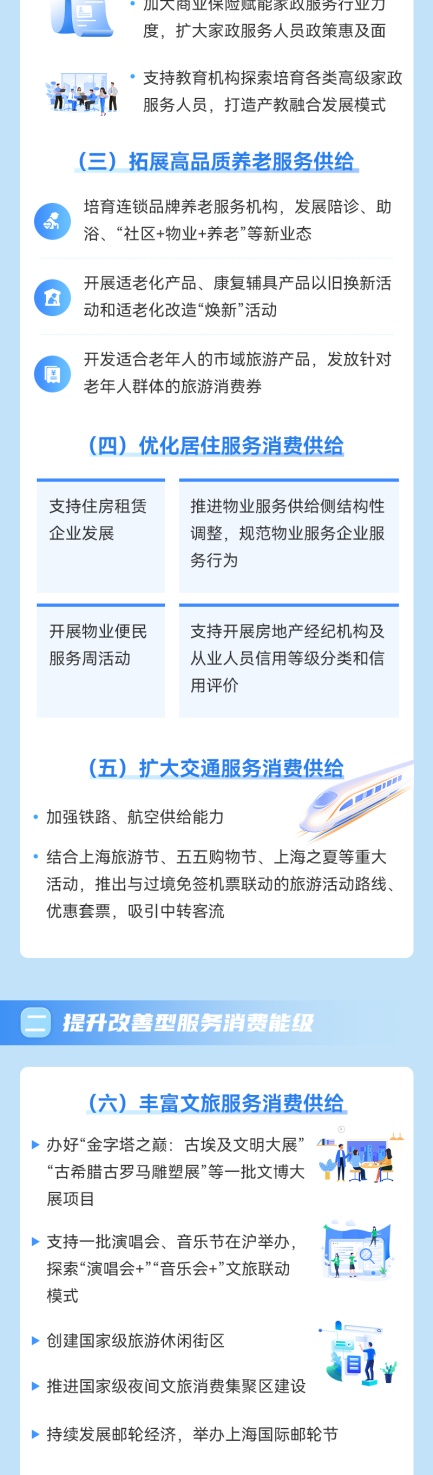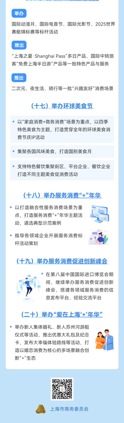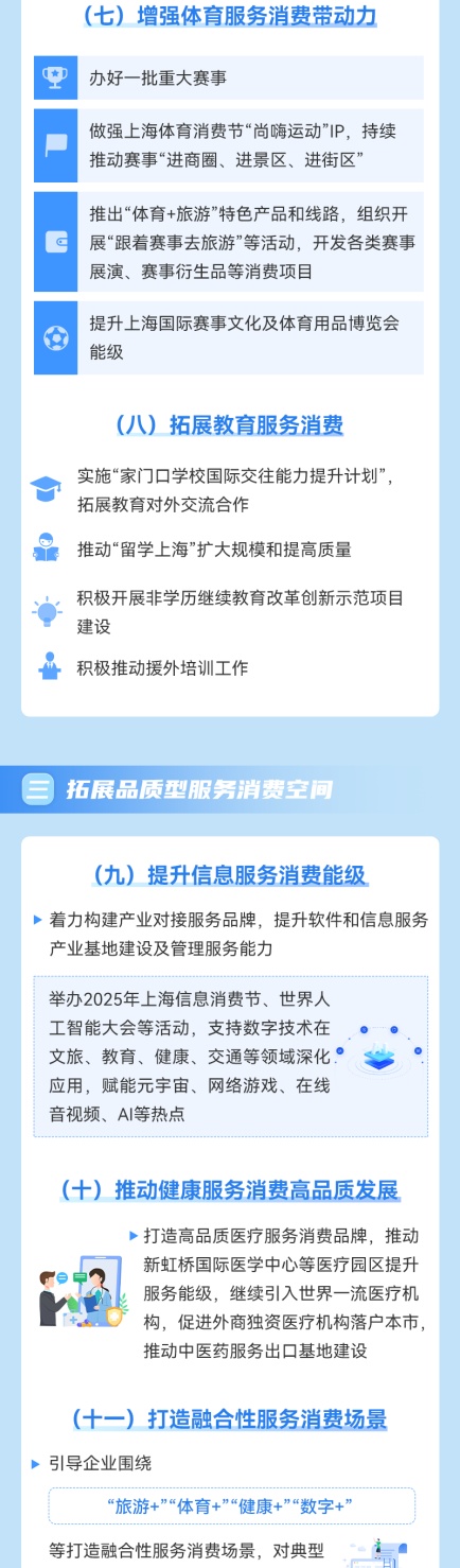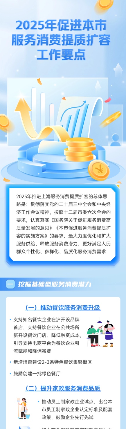 为最大力度优化和扩大服务供给、释放服务消费潜力,更好满足人民群众个性化、多样化、品质化服务消费需求,市商务委印发《2025年促进本市服务消费提质扩容工作要点》。该《工作要点》部署了挖掘基础型服务消费潜力、提升改善型服务消费能级、拓展品质型服务消费空间、健全服务消费政策支撑体系、打造标志性服务消费促进活动等五方面20项任务。详见图解↓