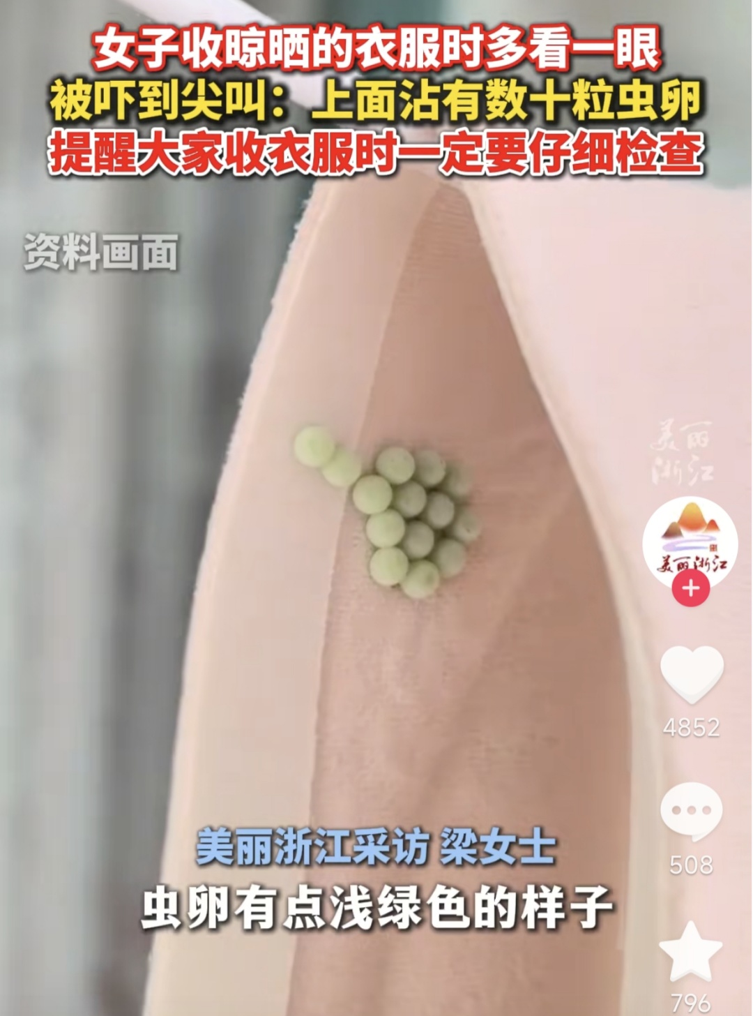 单纯的虫卵,其实并不会对人造成什么伤害,顶多也就看起来恶心了点。在收衣服时如果发现虫卵,不要用手直接碰触,可以用刷子或牙签把黏住的虫卵刷掉,之后再将衣物重新清洗干净。