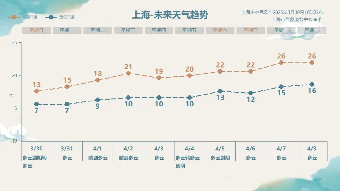 申城今天(3月30日)云系依然较多,是多云到阴的天气。早间气温较低,市区徐家汇站7.7℃,郊区多在2~7℃,白天升温乏力,最高气温仅13℃,体感偏冷,出门还是要多穿点。
