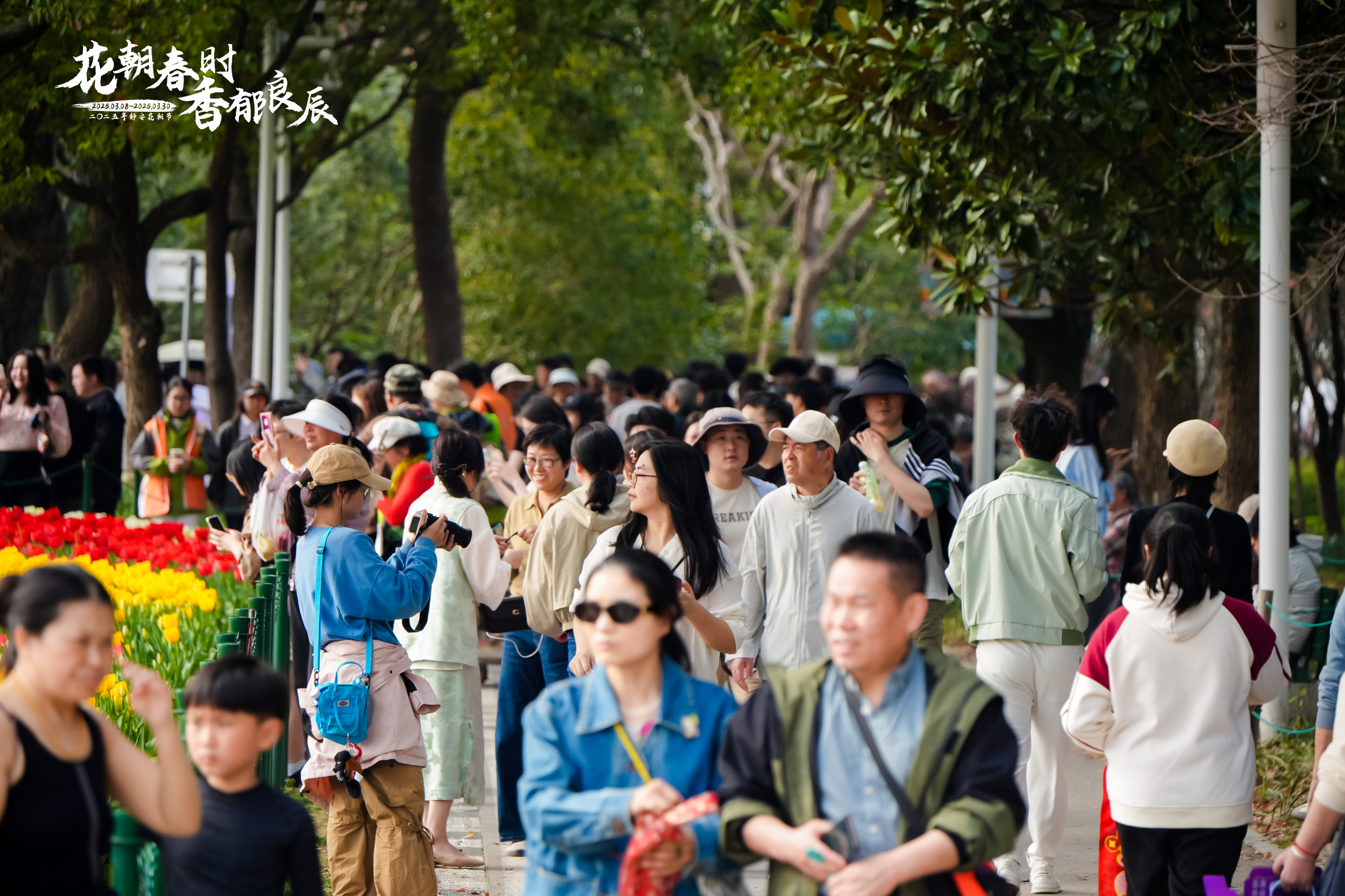 经统计,在晴好天气的加持下,静安花朝节主会场大宁公园单日客流突破6.5万人次,创历年新高。这背后,是静安花朝节“文旅商体展”联动所展现出的“魅力”:2025年静安半马将运动场景“植入”花海,报名人数超预期;举办花朝节国风集体婚礼,激发甜蜜消费新活力;推出汉服巡游与非遗市集,吸引传统文化爱好者;与公园“一路之隔”的大宁音乐广场推出“春风送信 花朝如约”共赴春日主题活动,与花朝节“交相辉映”;引入二次元IP,在园内打造年轻人喜爱的文化体验新场景……这种“赏花+”模式,让市民游客从“看一次花”变为“玩一整天”。