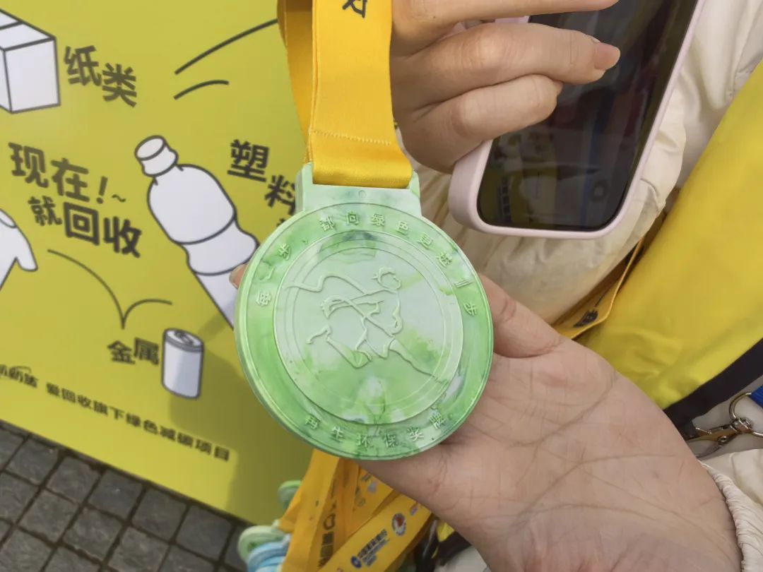 崇明区正在创建“无废城市”,本届赛事全过程融入“无废”理念,打造“无废赛事”。跑者和观赛市民可以在“爱回收”点位通过一些践行环保的小举措领取环保纪念奖牌。