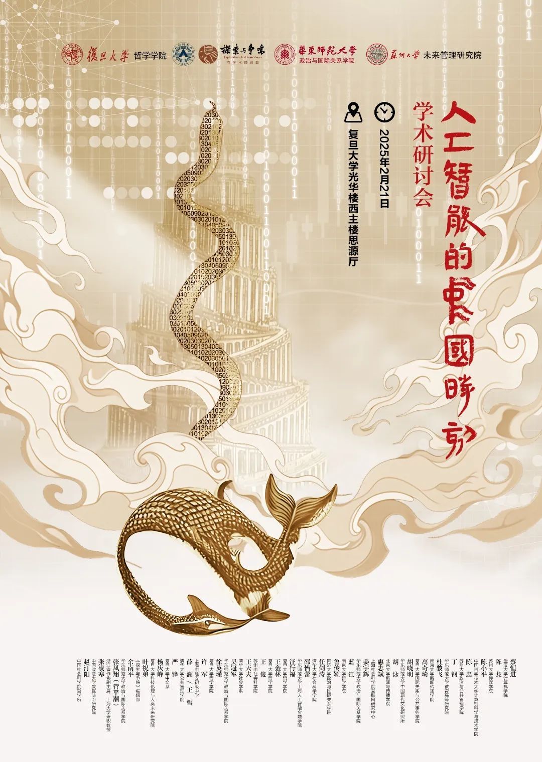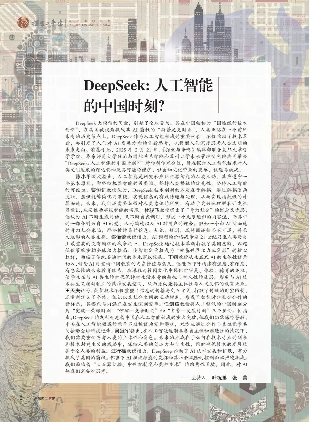 DeepSeek 大模型的问世,引起了全球轰动。其在中国被称为“国运级的技术创新”,在美国被视为挑战其 AI 霸权的“斯普尼克时刻”,人类正站在一个前所未有的历史节点上。DeepSeek 作为人工智能领域的重要代表,不仅推动了技术革新,亦引发了人们对 AI 发展方向的重新思考,也提醒人们深度思考人类文明的未来走向。有鉴于此,2025 年 2 月 21 日,《探索与争鸣》编辑部联合复旦大学哲学学院、华东师范大学政治与国际关系学院和苏州大学未来管理研究院共同举办“DeepSeek: 人工智能的中国时刻?”跨学科学术会议,旨在探讨人工智能技术对人类文明发展的深远影响及其可能给经济、社会和文化带来的变革、机遇与挑战。