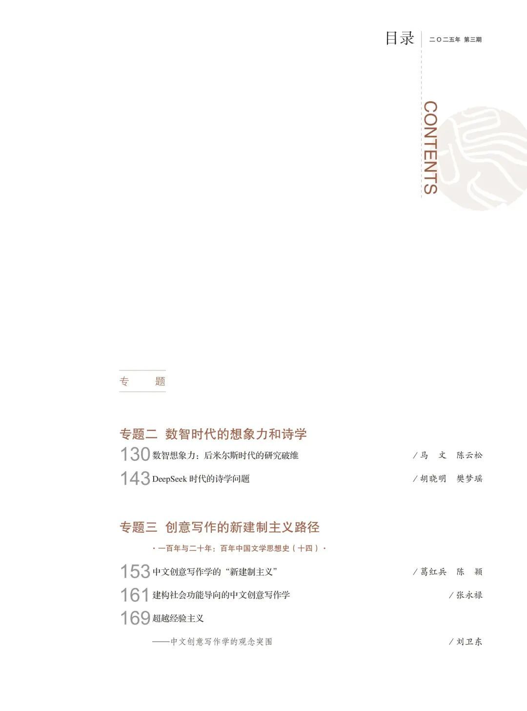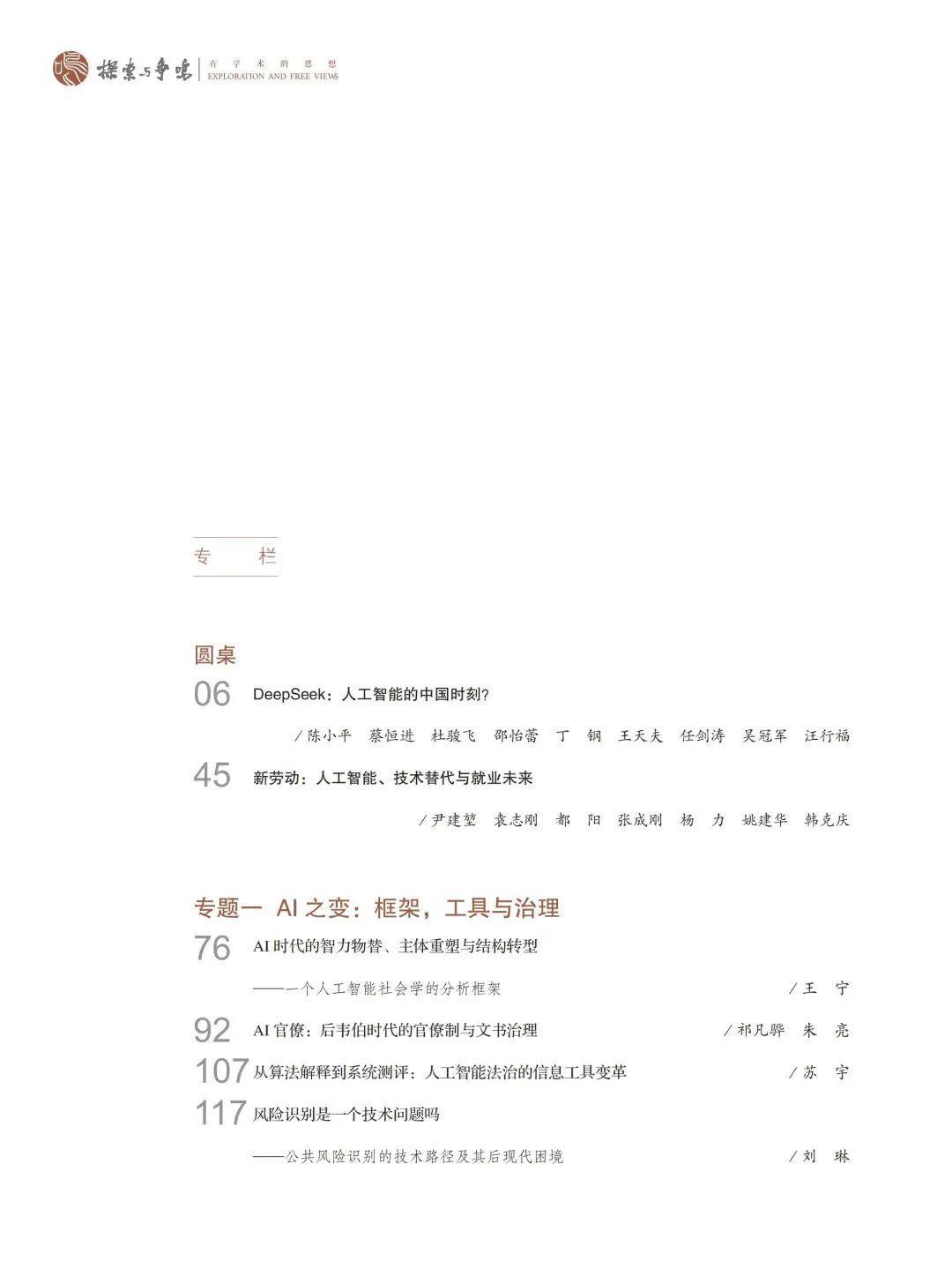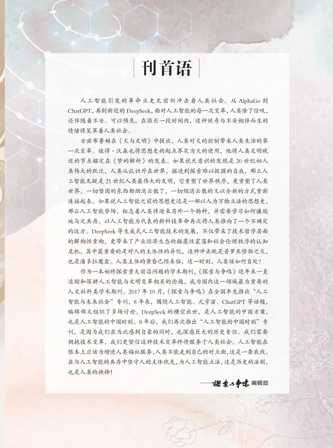 作为一本始终探索重大前沿问题的学术期刊,《探索与争鸣》近年来一直追踪和深耕人工智能与文明变革相关的论题,成为国内这一领域最为重要的人文社科类学术期刊。2017年10月,《探索与争鸣》在全国率先推出“人工智能与未来社会”专刊,8 年来,围绕人工智能、元宇宙、ChatGPT 等话题,编辑部又组织了多场讨论。DeepSeek 的横空出世,是人工智能的中国方案,也是人工智能的中国时刻。8 年后,我们再次推出“人工智能的中国时刻”专刊,是因为我们在为此感到自豪的同时,也深感巨大的历史责任。我们需要拥抱技术变革,我们更坚信这种技术变革终将服务于人类社会。人工智能在根本上应该为增进人类福祉服务,人类不能走到自己的对立面,这是一条底线。在与人工智能的共存中坚守人的主体优先,为人工智能立法,这是历史的法则,也是人类的抉择!