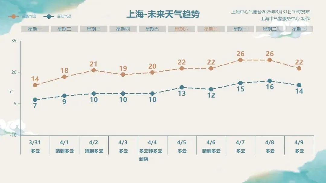 上海市气象局服务首席邬锐告诉记者:“从周三开始,本市最高气温或将突破20℃,在19~22℃之间浮动,最低气温也会站上10℃。到周末,最低气温也将达到12~13℃。清明节假期马上要到了,现在来看,假期以晴或者多云的天气为主,整体比较暖和,非常适合踏青赏花或者是祭扫的活动,但是早晚的温差比较大,所以大家要注意春捂,特别是早晚要多穿一些。”