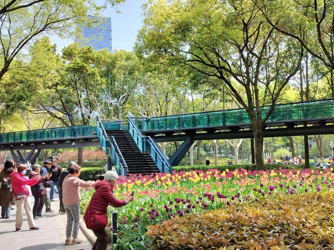 汇金湖畔,游客们闲坐湖边感受春日暖阳的照耀,园内花卉正值盛季,郁金香、海棠等吸引了不少路人驻足观赏。