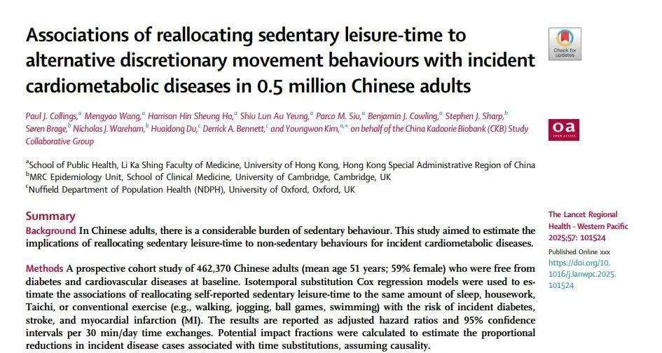 近期,《柳叶刀》子刊“The Lancet Regional Health-Western Pacific ”的研究,分析了近50万中国人发现,每天少坐30分钟,有利于心血管健康。