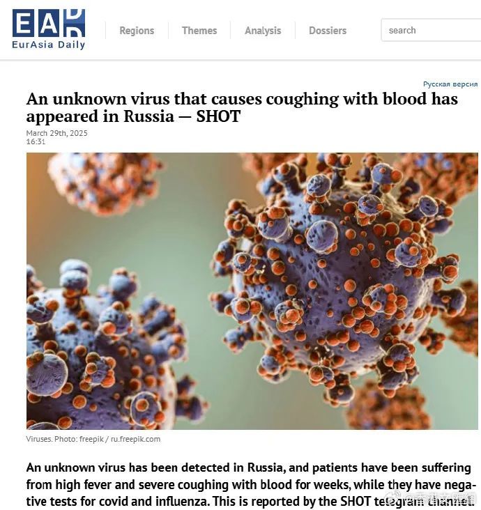 3月29日,据俄新社报道,俄罗斯疑似出现了一种未知病毒,患者感染症状包括咳嗽带血和高温达39度,同时新冠病毒和流感的检测结果均为阴性。