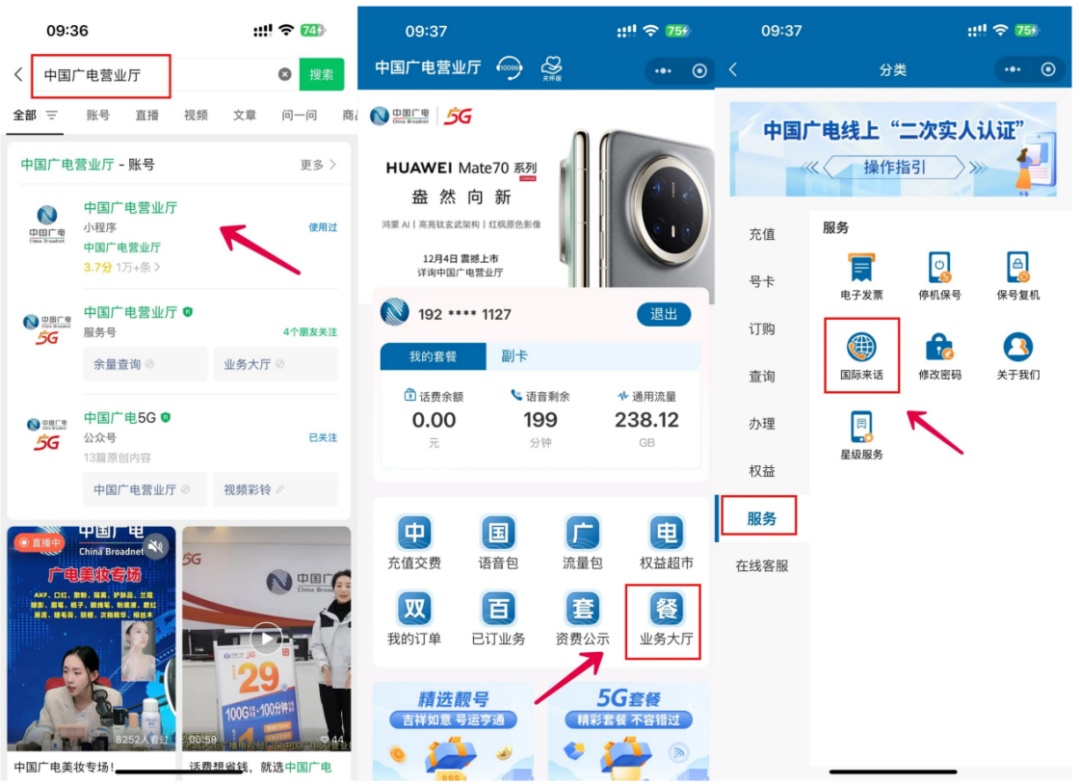 第一步:搜索“中国广电营业厅”微信小程序,依次选择“业务大厅”→“服务”→“国际来话”(需手机号登录)。