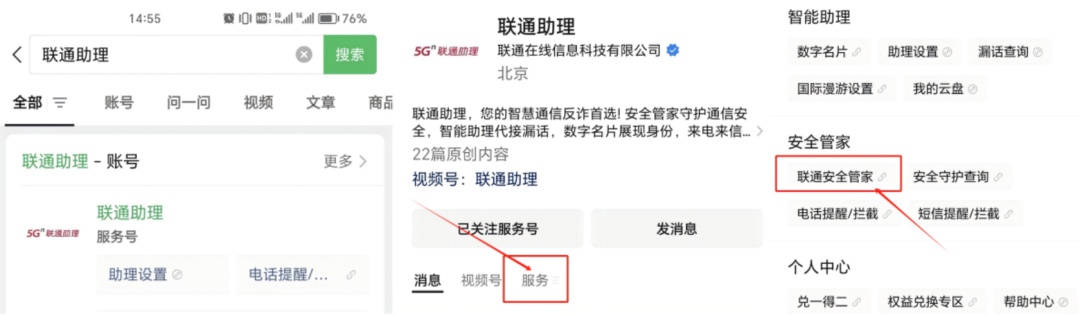 第一步:微信搜索“联通助理”并进入该服务号,点击下边“服务”菜单,选择“联通安全管家”(需手机号登录)。