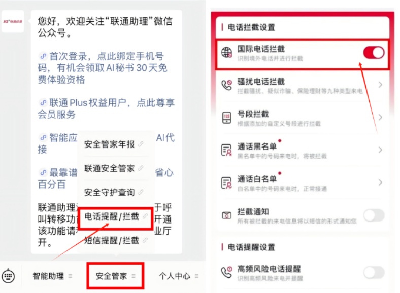第二步:选择“电话提醒/拦截”,找到“国际电话拦截”右侧开关,点击打开即可(显示红色表示已打开)。