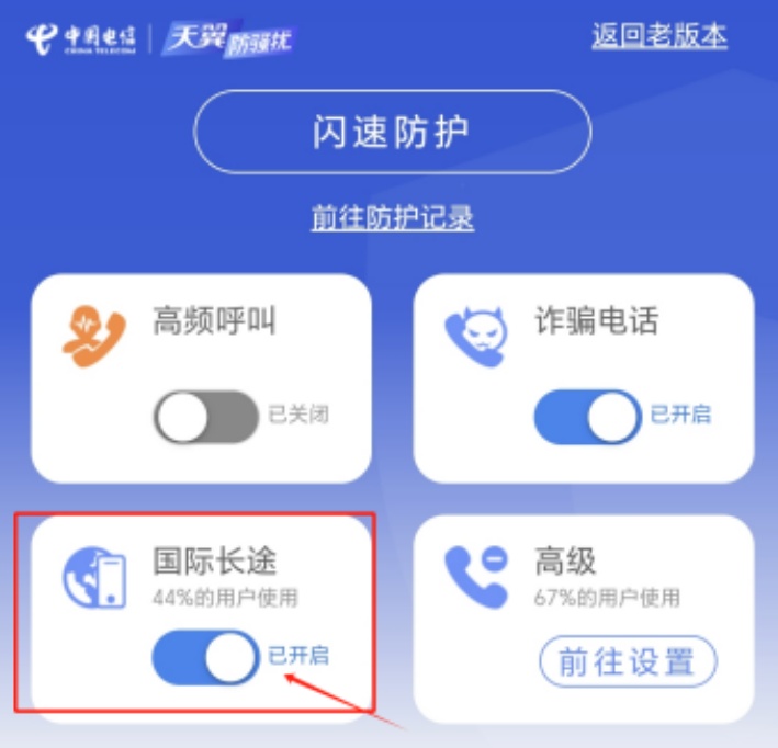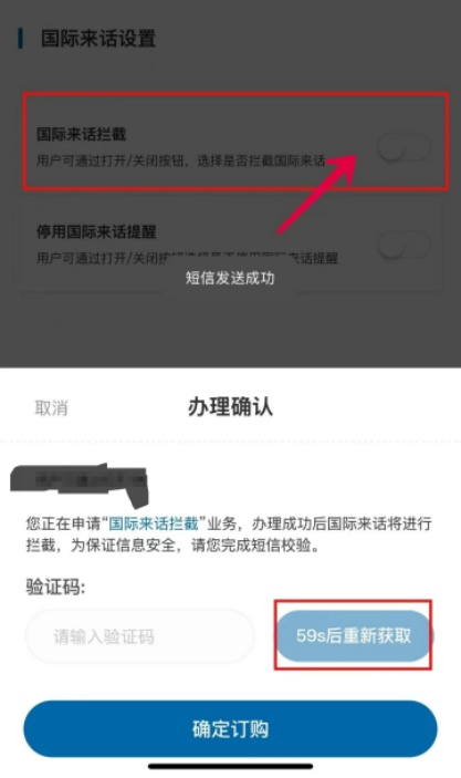 第二步:找到“国际来话拦截”右侧开关,点击并获取验证码,输入验证码后拦截功能开启。