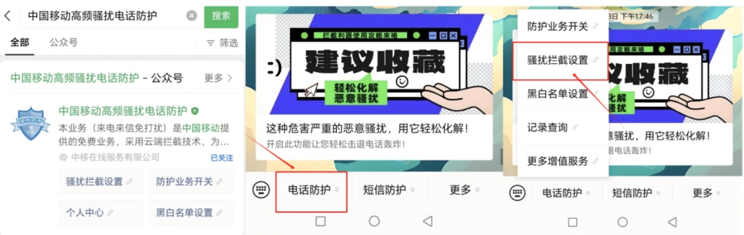 第一步:微信搜索“中国移动高频骚扰电话防护”并进入该服务号,点击底部菜单栏,依次选择“电话防护”→“骚扰拦截设置”(需手机号登录)。