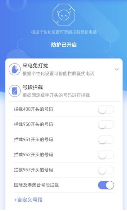 第二步:在骚扰拦截设置页面,找到“国际及港澳台号段拦截”右侧开关,点击打开即可(显示蓝色表示已打开)。