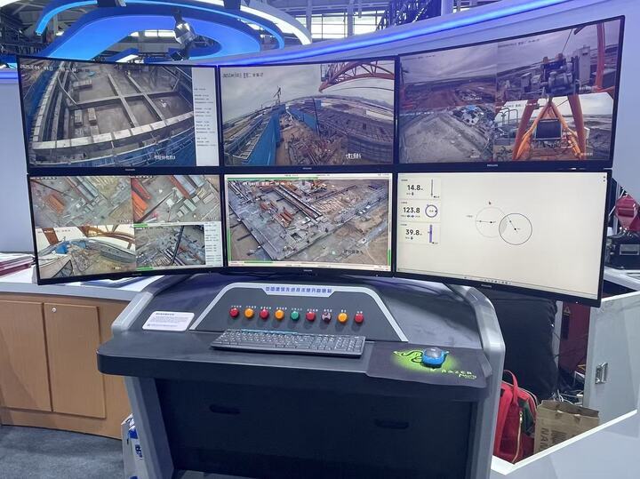 在智能建造展区,记者看到这里展示了“BIM+”数字一体化设计、建筑机器人及智能装备等技术成果。一款智能塔机无人驾驶操作系统吸引很多人驻足。中建云控(苏州)智能技术有限公司专业工程师刘凡边演示边说,这套塔机智能集控系统由他们集团自主研发,专为施工现场塔机量身定制,由数据感知、网络传输、远程操控等模块组成。在塔机上加装这套系统,可以变塔机高空操作为地面操作。人机协同,既能保障人员安全,又能减少约30%人员投入,提高吊装效率约30%。