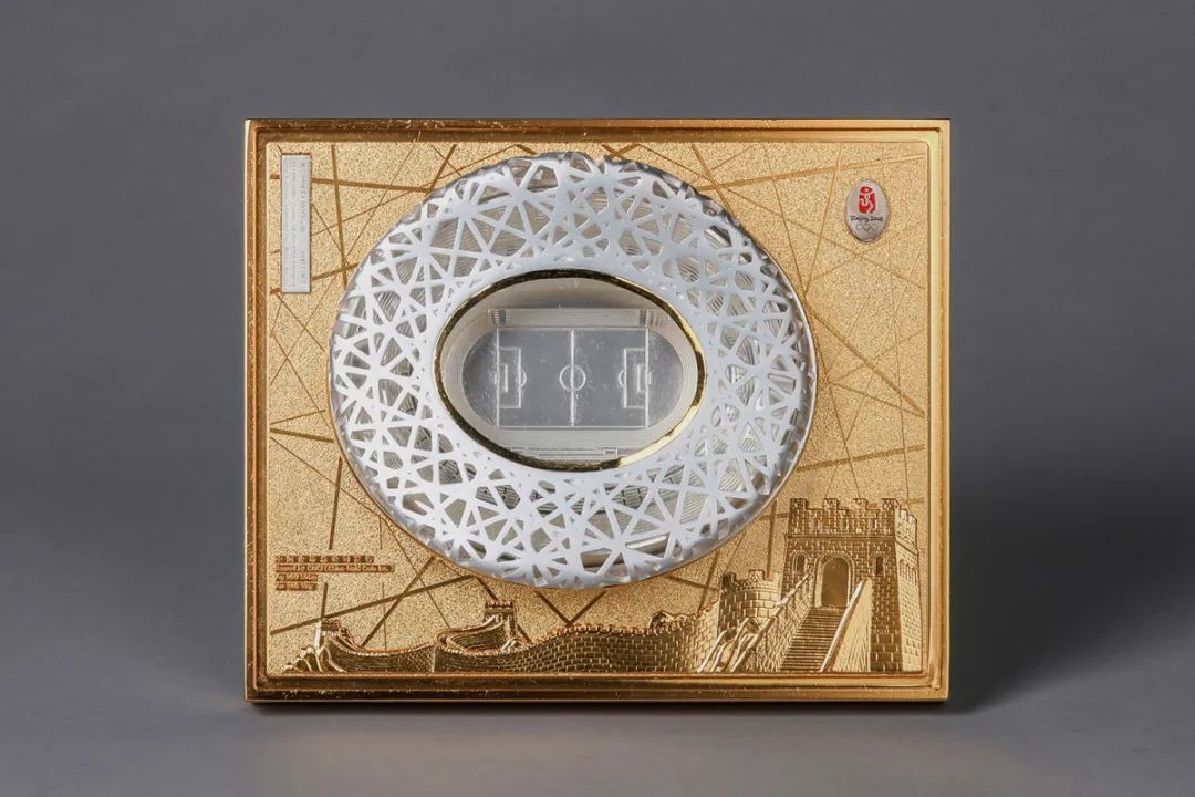 在上海体育博物馆内,珍藏有一件第29届北京夏季奥运会鸟巢摆件。此摆件按照第29届奥运会主会场中国国家体育场原样复制。底座表面图案:北京奥运会会徽、长城及“中国金币总公司发行”等字样。底座侧面图案:奥运会运动项目标识及会馆名称、场地类型、地点、建筑面积等场馆信息。底座镶方牌字样:“第二十九届奥林匹克运动会——国家体育场”。摆件由第29届奥林匹品运动会组织委员会授权,中国金币总公司发行,上海金币投资有限公司经销。