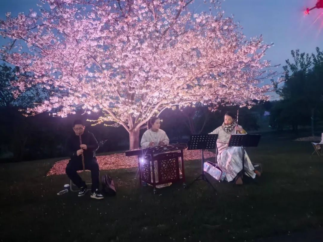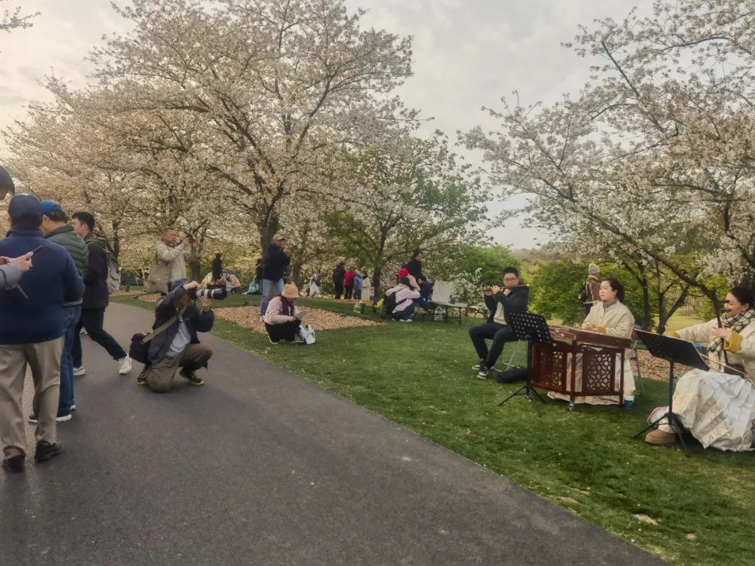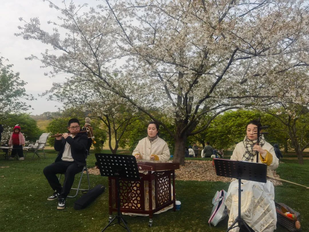 只见樱花树下一架扬琴摆在中间,一名扬琴乐手端坐其后,二胡、长笛两名乐师分别坐在两侧。《行街》《欢乐歌》《春晖曲》《紫竹调》《中花六板》……在三名乐师的默契合奏下,一曲曲悠扬的旋律流淌出来。游客们纷纷驻足聆听,摄影师们齐刷刷将镜头对了过来。曲调低回处,风卷起花瓣飘落至琴弦上、乐师的长裙上。“太美了,耳朵和眼睛一起‘醉’了!”一名游客赞叹道。