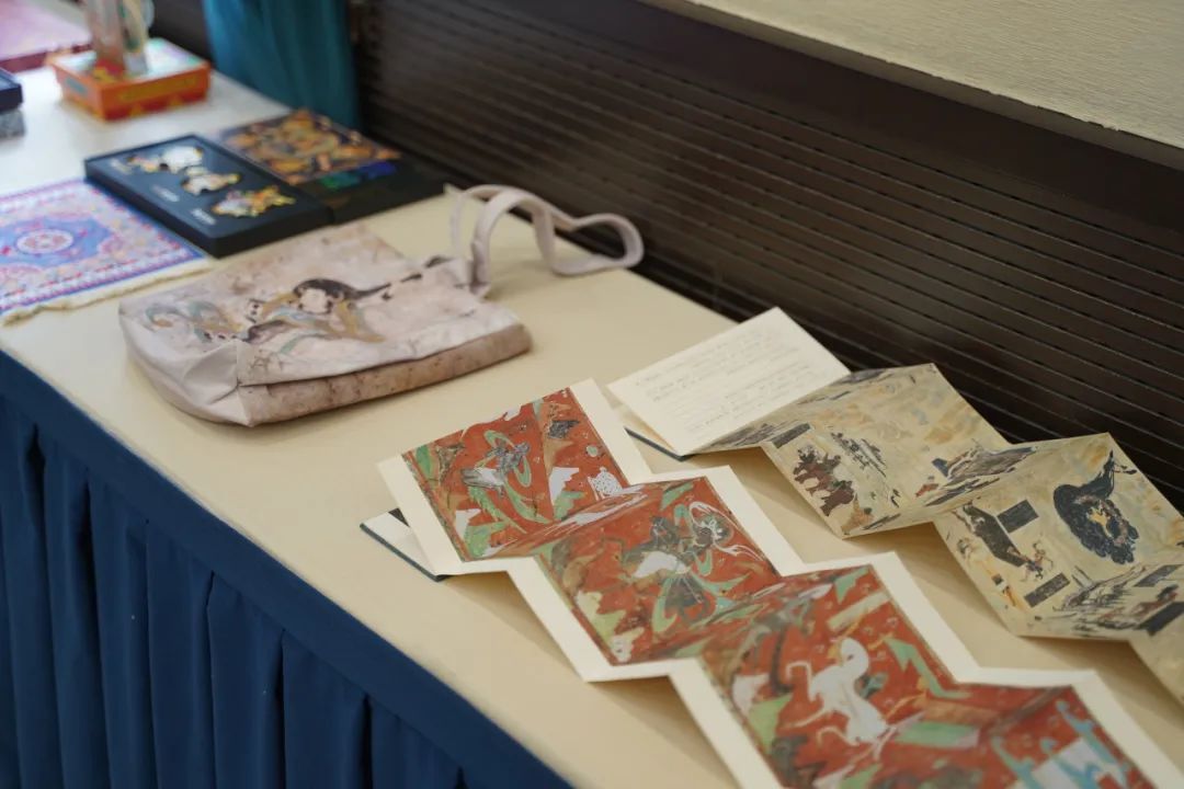 活动现场,陈列于两侧的史敦宇壁画复原作品与敦煌文创展示成为观众驻足的焦点。讲座的后半段集中呈现了史敦宇老师带来的敦煌壁画临摹精品,其中既有《鹿王本生图》《都督夫人礼佛图》等多幅经典形象,也有唐代飞天、供养人的传神线描,读者与留学生们纷纷被史敦宇布画作品中的精美色彩所震撼,同时也对敦煌壁画中的故事有了更深入的了解。