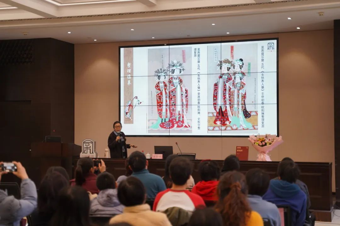 摇曳的洞窟油灯、沙土与矿物颜料的气息……史敦宇老师以细腻笔触还原了父辈在莫高窟临摹的日常。她特别提到4岁时成为段文杰先生“小助手”的经历,让她深刻理解了壁画复原的意义:“我们不仅要恢复残损壁画的构图与色彩,更要重现其直指人心的艺术魅力。”讲座中,史敦宇老师通过高清壁画影像与临摹复原手稿,揭示了敦煌艺术“以形写神”的创作理念。